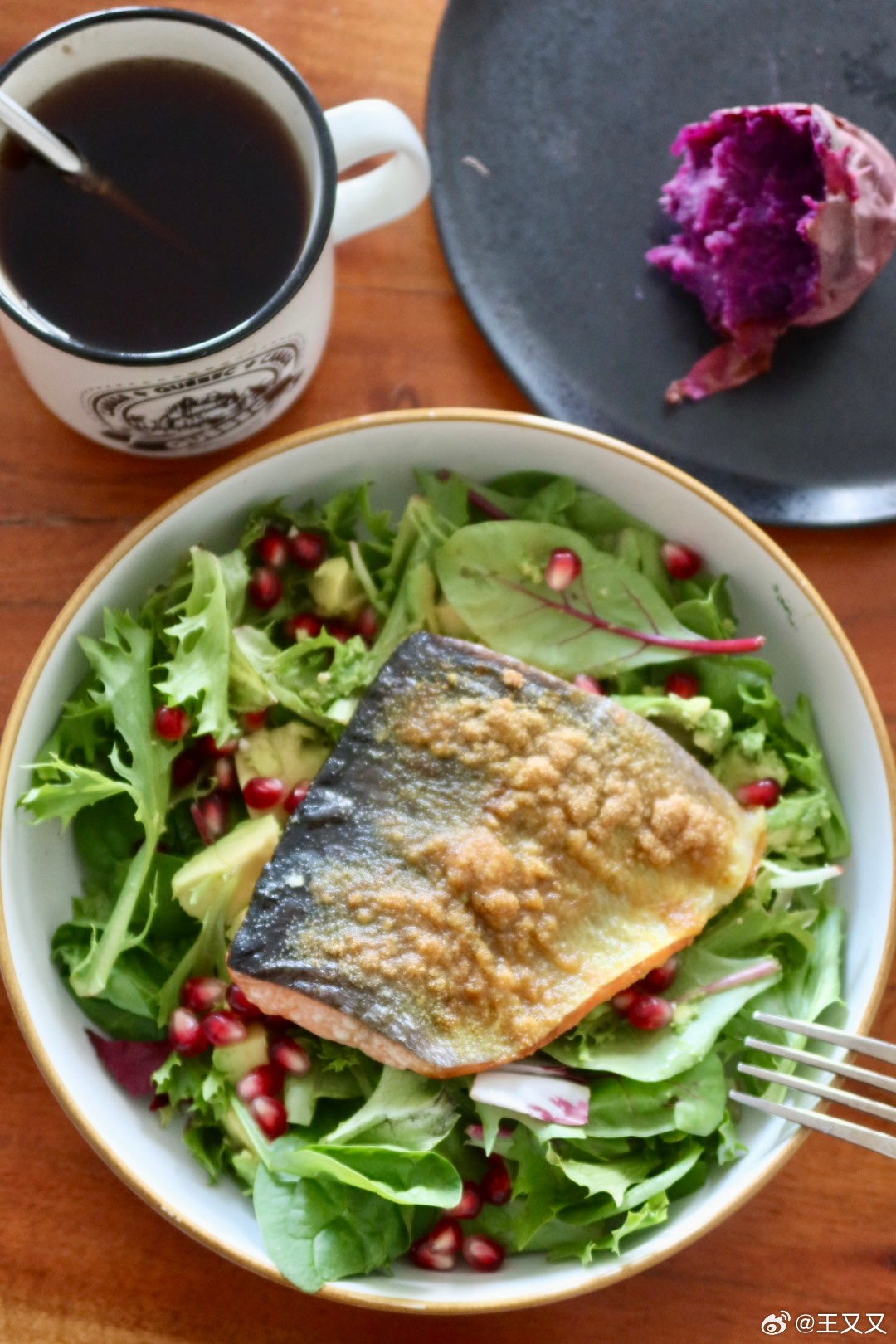 午餐:姜黄蒜粉烤野生阿拉斯加三文鱼石榴牛油果🥑沙拉🥗、烤紫薯、🍵