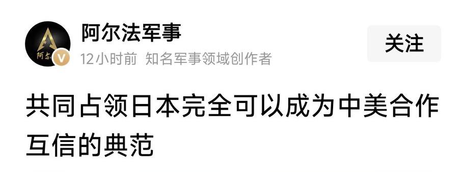 网友提出中美共同占领日本作为合作互信典范,这想法挺新奇。当下中美缺乏战略互信,很多合作提议难以推进,像美国的“G2”咱们就不敢接,怕被挖坑。 雅尔塔会议曾计划中美英苏分治日本,中国占四国岛。从战略角度看,继续执行这个方案似乎有一定道理,随着美国实力衰落,亚太收缩是趋势。 不过这只是理论设想。而且看看新加坡,曾被日本占领有血泪史,现在却成铁杆盟友发展经济合作。国际关系复杂多变,中美共同占领日本要成为合作典范,面临的现实阻碍可不少。 对此你怎么看? 带定位晒今日生活 我的今日状态:😁轻松愉快 我这里的天气:☀️晴天