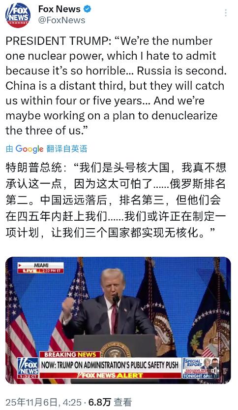 特朗普今天(北京时间11月6日)表示:“我们是头号核大国,我真不想承认这一点,因为这太可怕了……俄罗斯排名第二。中国远远落后,排名第三,但他们会在四五年内赶上我们……我们或许正在制定一项计划,让我们三个国家都实现无核化。” 先说说他挂在嘴边的“头号核大国”到底有多厚的家底,按瑞典一个研究和平的机构统计,美国现在随时能用上的核弹头就有一千七百多枚,再加上库存的,总数早超五千枚了。这些大杀器的威力,足够把地球翻来覆去炸好几遍。 更该提的是,美国是迄今为止唯一一个真在打仗时用了核武器的国家,当年广岛、长崎的惨剧,到现在都是人类心里的疤。可现在手里攥着最多核弹的人,反倒装起了“害怕核武器的代言人”,这演技比好莱坞大片里的演员还夸张。 再说说他嘴里“远远落后”的中国,咱们的核政策从来都说得清清楚楚。从1964年第一颗原子弹炸响那天起,中国就承诺“不先用核武器”,后来又明确说了,永远不对没核武器的国家和地区用核武器,这在全世界核大国里,是独一份的保证。 咱们的核力量一直就保持在“刚好能起到威慑作用”的水平,连外国媒体都承认,中国有核武器这五十年,从没拿核武器吓唬过谁,更没跟别的核大国搞过军事小团体。对比下来,美国一边举着核弹大棒在全世界耍威风,一边又给中国扣上“要追上来威胁他们”的帽子,这双重标准玩得比谁都溜。 最让人觉得可笑的是特朗普提的“无核化计划”。这些年美国嘴上喊着要减少核武器,实际干的全是反事儿,要么砸大钱升级自己的核弹,提高这些武器实战能用的水平;要么在“别让更多国家有核武器”这件事上搞两套标准,对自己的盟友就睁一只眼闭一只眼,对别的国家就动不动施压。 现在突然拉上中、俄谈无核化,说白了就是想把中国和俄罗斯拉到跟他一样的线上“减核”,他自己则靠着技术优势继续保持霸权,这点小算盘谁看不明白? 中国从来没藏着掖着要发展必要的核力量,历史早告诉我们了:手里没点核威慑,根本扛不住别人用核武器吓唬你。但咱们的目标从来不是跟美国、俄罗斯比谁的核弹多、规模大,只是想保住“你有我也有”的底线安全。 特朗普说中国“四五年内就能追上美国”,说白了就是故意制造恐慌,好给自己扩核找由头。要知道,中国早就主动停了核试验,还签了《全面禁止核试验条约》,可美国到现在都没批准这个条约。谁是真心想维护和平,谁在演霸权的戏,明眼人一看就清楚。 真要谈无核化,美国得先干两件事,一是把自己的核弹头数量减到跟中国差不多的水平,二是兑现“不先用核武器”的承诺。攥着全世界最多的核弹喊“核武器可怕”,对着中国防御用的核力量说“有威胁”,这种假惺惺的样子骗不了人。 核安全不是靠嘴说就能保住的,更不是霸权国家拿来耍威风的玩具。想让世界离核威胁远一点,先把自己家的核弹库好好清清,这才是真格的。