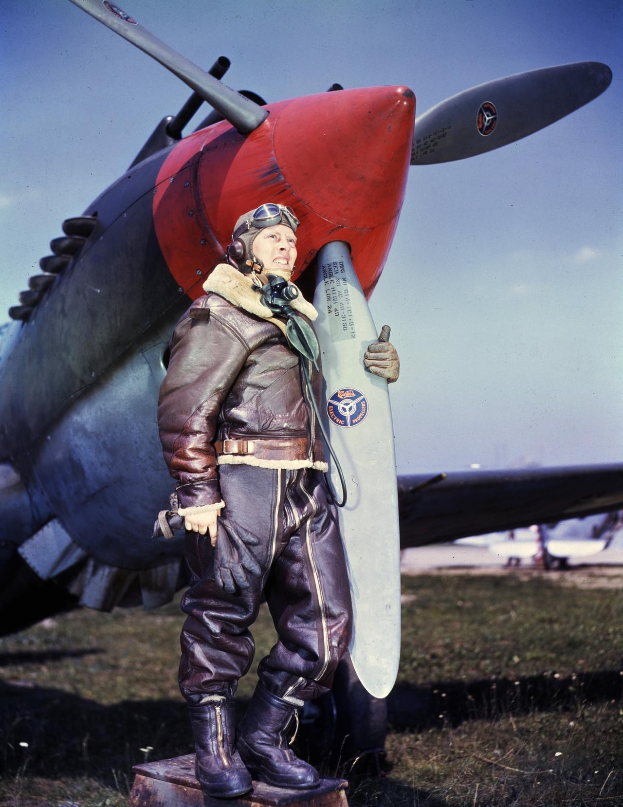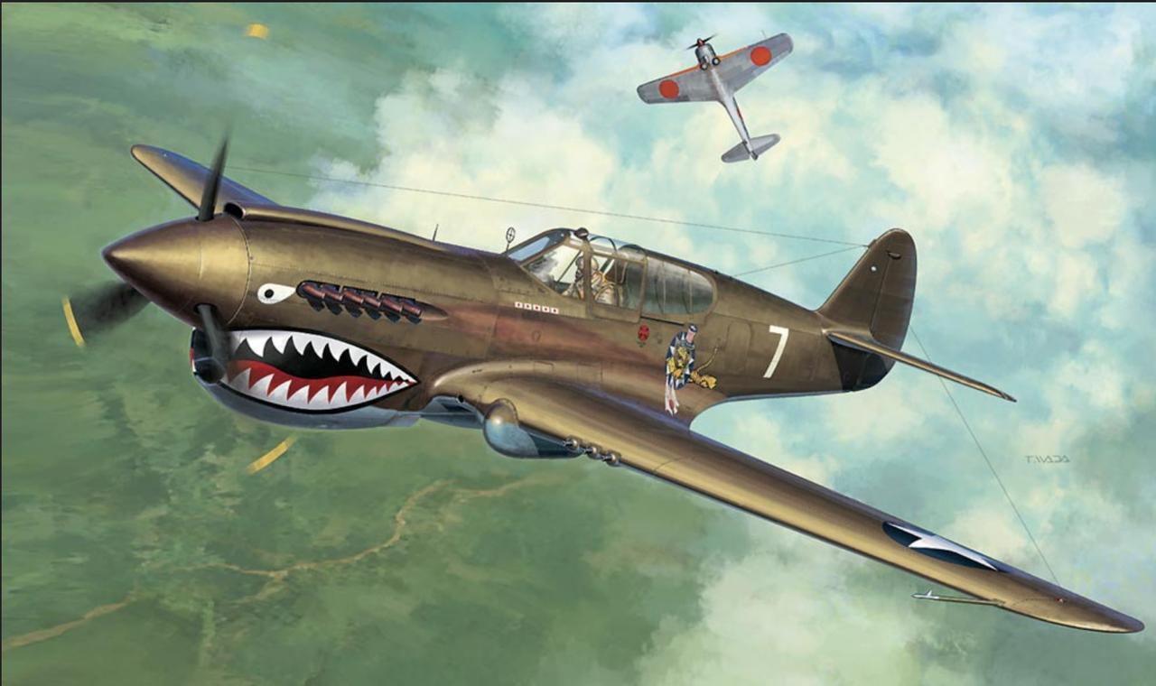 1941年,一名美军P-40战斗机飞行员站在自己战机的螺旋桨旁留影。飞行员配备全套飞行装备:A-6飞行靴、B-3夹克、A-3长裤、B-7护目镜以及A-8氧气面罩。 P-40是寇蒂斯公司研制的单座战斗机,配备艾里逊V-1710液冷发动机,最大时速580公里,中国战场曾由飞虎队使用并绘有鲨鱼嘴涂装。该机有多个绰号,比如“战斧”“ 鹰”,等等。 P-40战斗机在抗战时发挥了重要作用,没有让制空权完全落入日军之手(参见图2~3)。