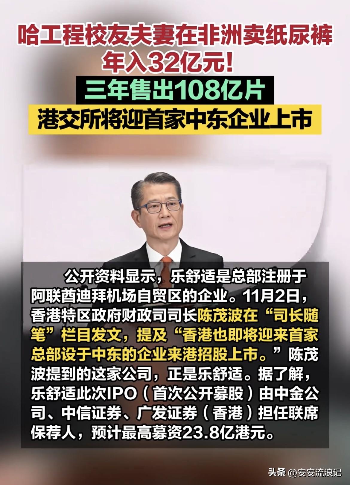 哈工大夫妻在中东卖纸尿裤闯出了一片天,这故事太牛了!这对70后“学霸”夫妻沈延昌、杨艳娟,毕业于哈尔滨工程大学。2004年沈延昌在广州创立森大集团做海外贸易,2009年开展快消卫生用品业务,后来有了乐舒适。 乐舒适被称为“非洲纸尿裤之王”,2024年其在非洲婴儿纸尿裤和卫生巾市场份额分别达20.3%及15.6%,在多个非洲国家的婴儿纸尿裤市场排第一,三年售出108亿片。如今乐舒适二次递表港交所,拟全球发售9088.4万股,预计最高募资23.8亿港元,还引入15家知名机构做基石投资者。这创业经历简直就是现实版的商业传奇!