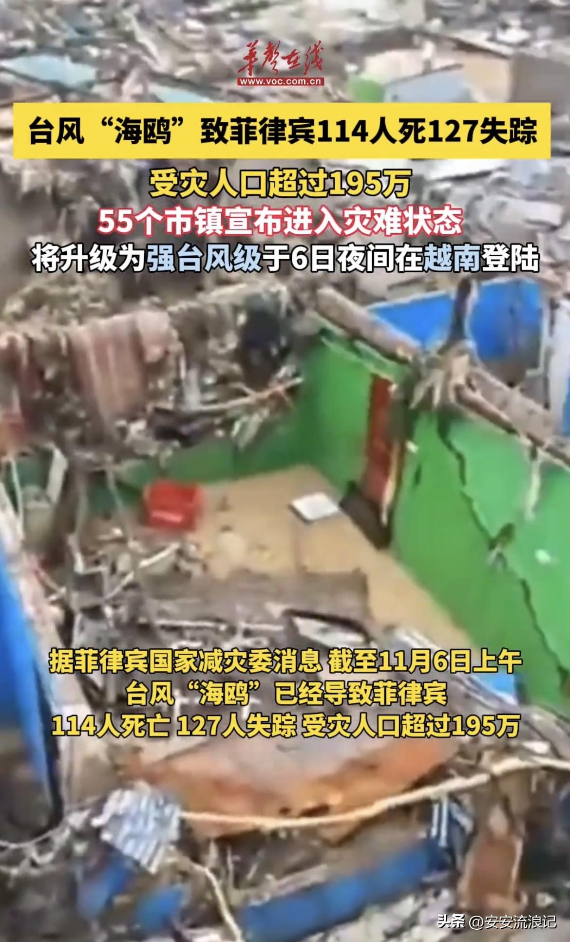 台风“海鸥”太可怕了!截至11月6日上午,它已让菲律宾114人死亡、127人失踪,受灾人口超195万。4日凌晨“海鸥”登陆菲律宾,5日上午其中心位于巴拉望省埃尔尼多附近,以每小时25公里速度向西北移动,最大持续风速每小时120公里,瞬时风力最高达165公里。它自东向西横扫中部,带来狂风暴雨,引发洪涝和山体滑坡。为此,菲律宾总统马科斯6日宣布国家进入灾难状态,还要应对即将到来的超强台风,希望菲律宾能早日度过难关。