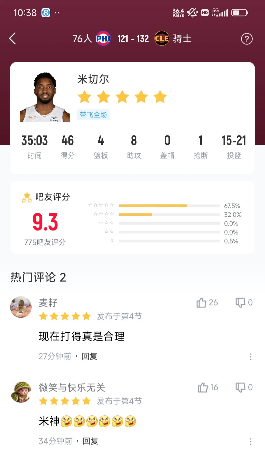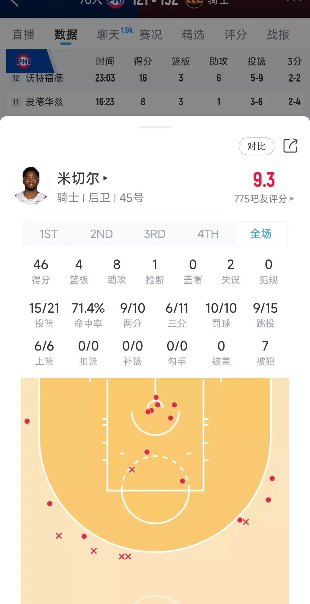 米切尔46分骑士战胜76人米切尔超神表现,狂轰46分4板8助1断。