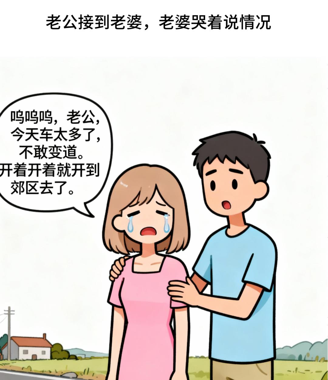 趣味漫画:老婆拿驾照:开车上班!高峰期:车多不敢变道,开到郊区。老公打车:师傅郊区去吗?接回哭诉:呜呜车多开到郊区