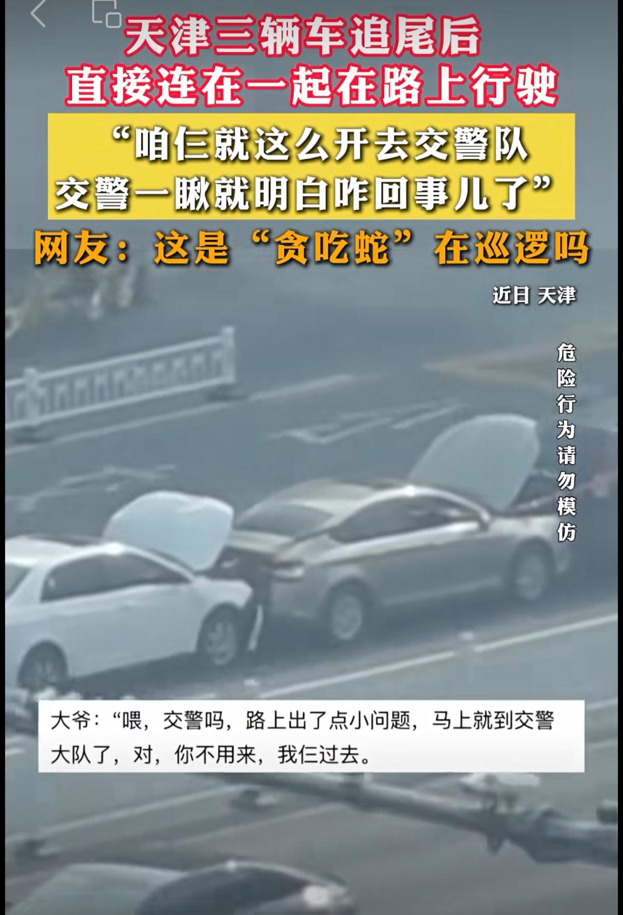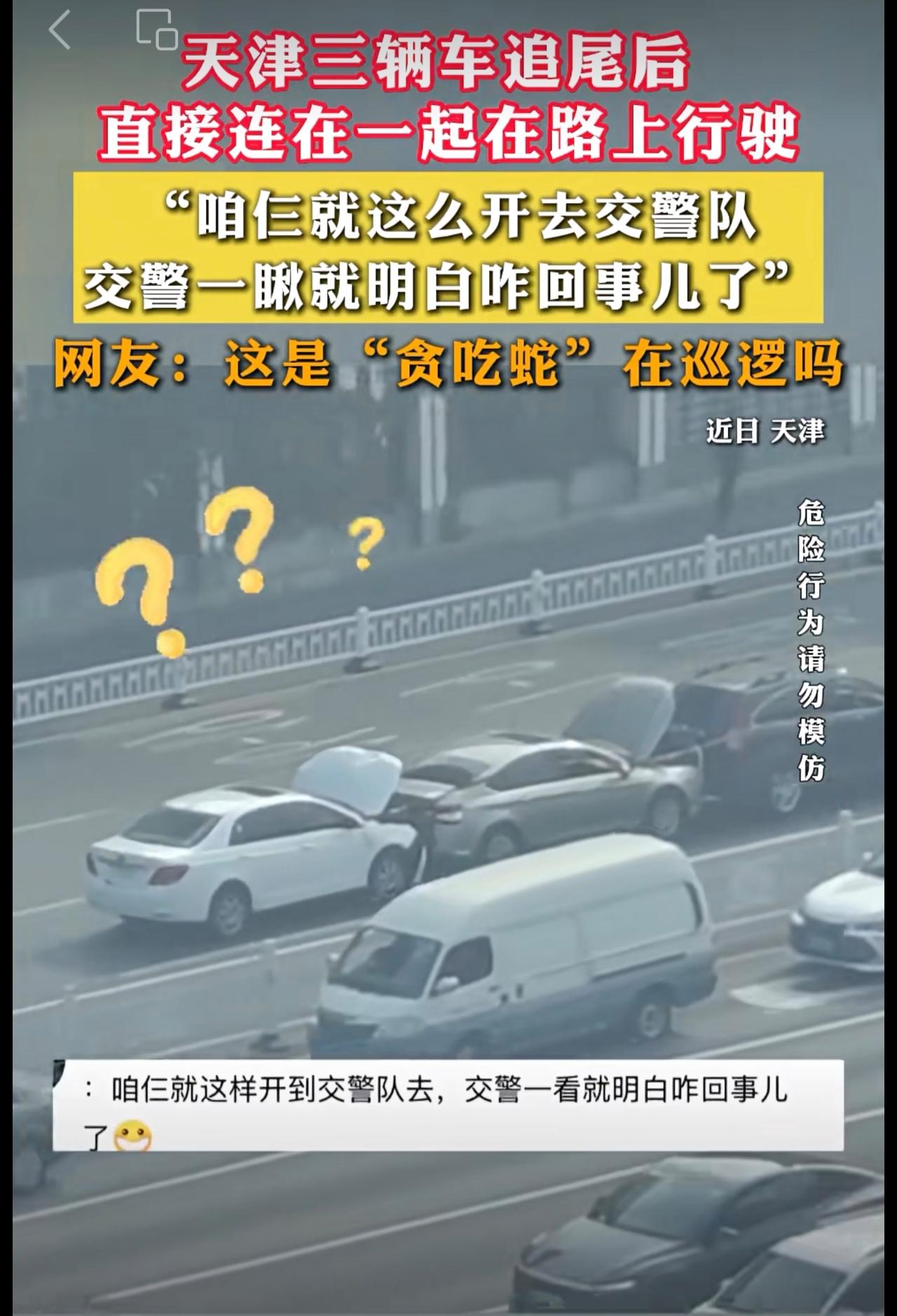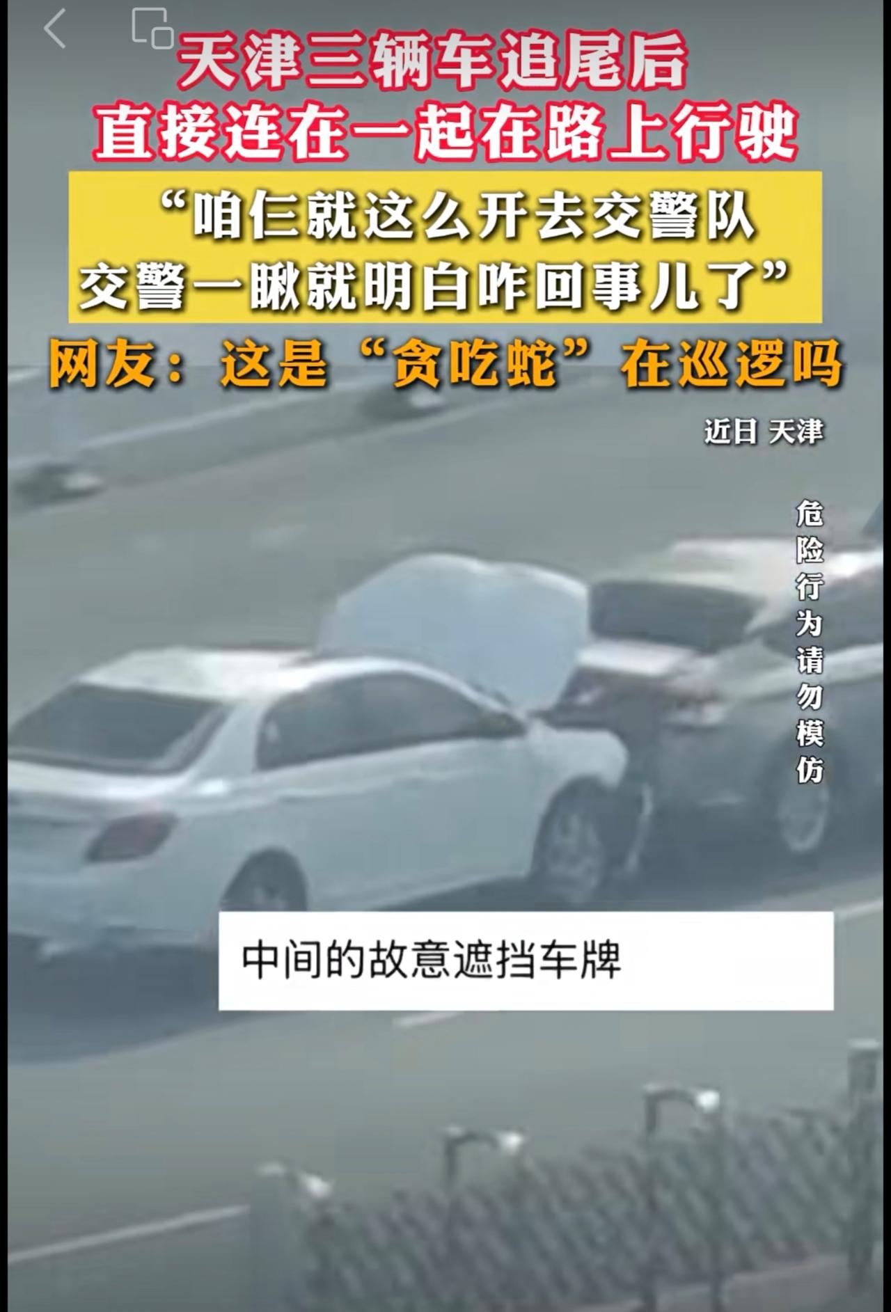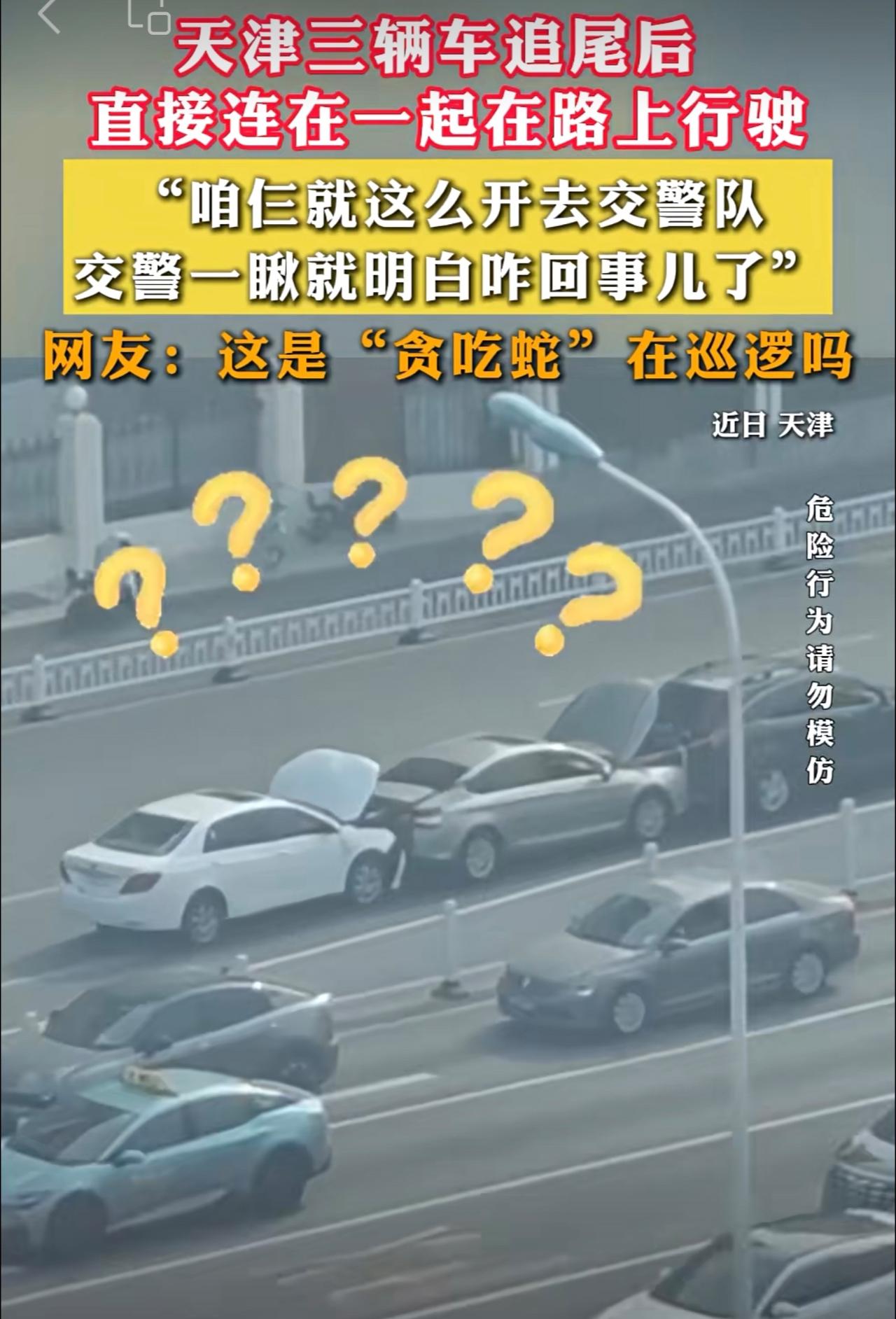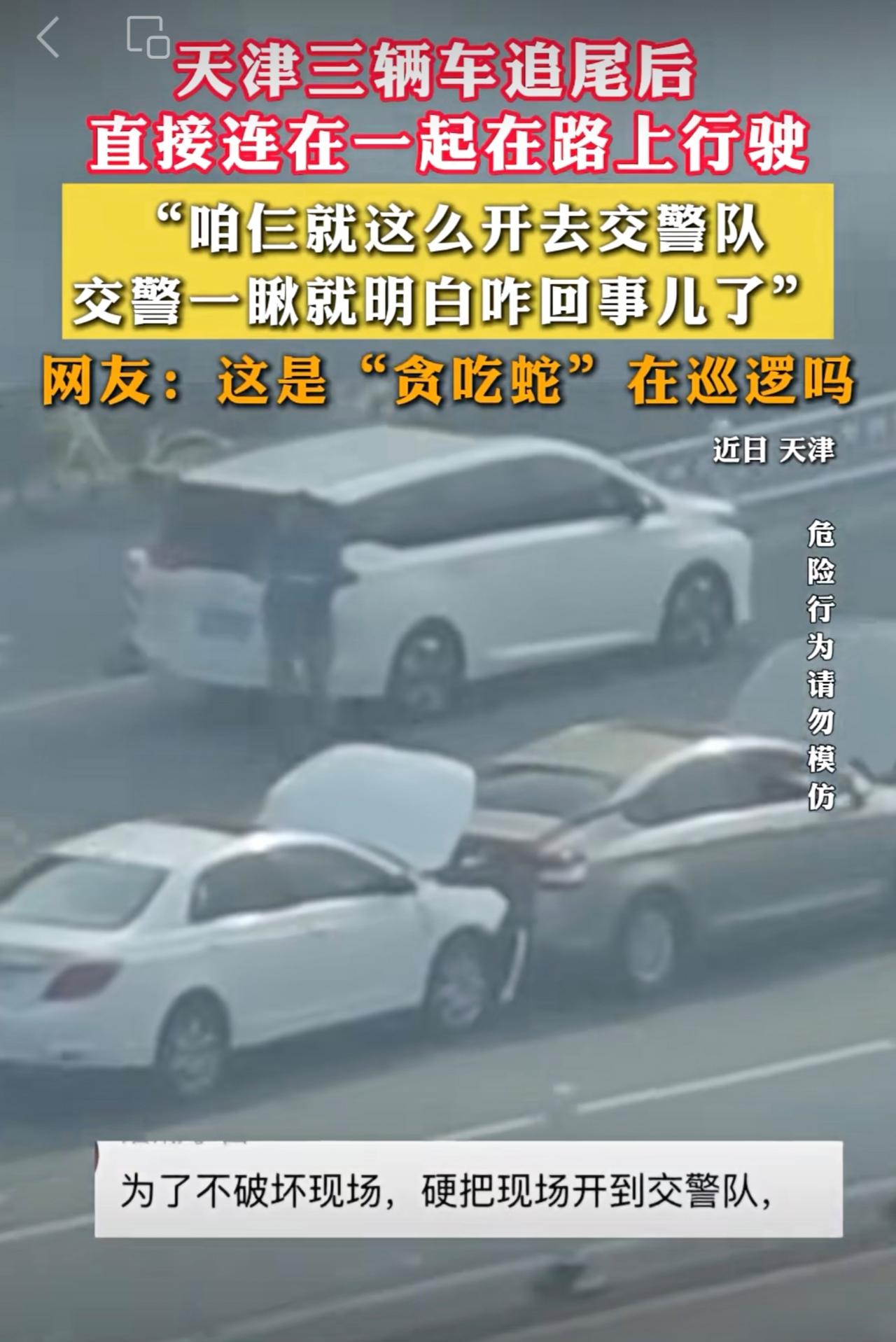天津三辆车追尾后 ,直接连在一起在路上行驶。网友:这是“贪吃蛇”在巡逻吗。