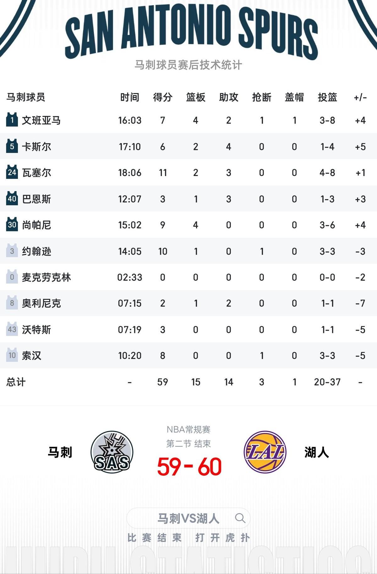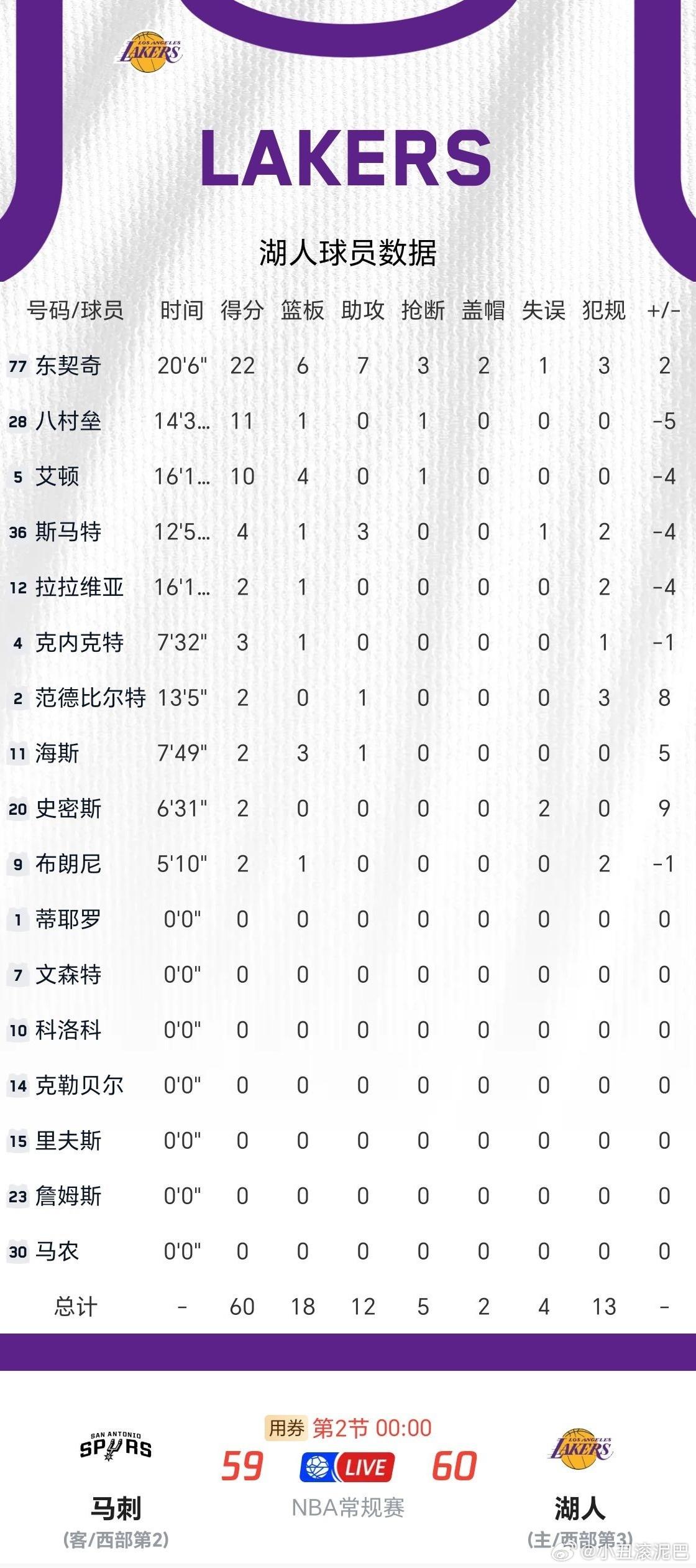 半场结束,湖人60-59马刺。东契奇半场22分6板7助,今天三双没问题吧。 湖人上了场的球员中只有2个正负值为正数,东契奇和小史密斯。 文班亚马7分4板2助,今天被湖人群魔压制了,根本无法发挥。