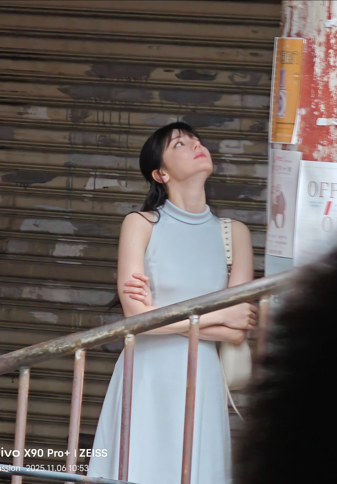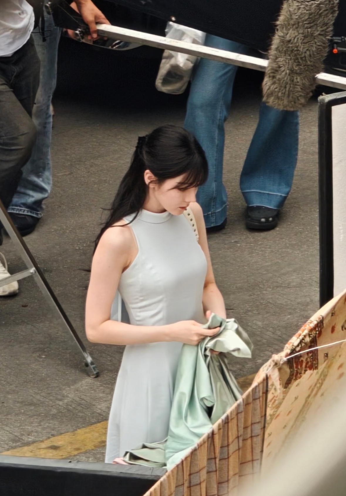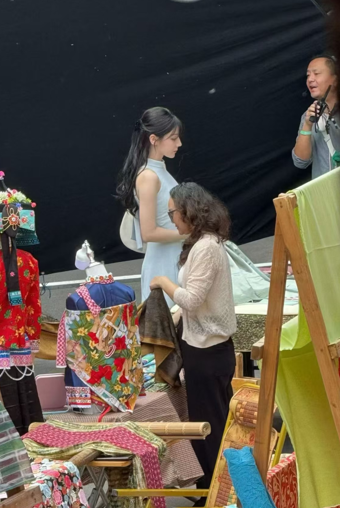 迪丽热巴帮替身整理发型迪丽热巴齐刘海浅蓝色无袖长裙 怎会美成这样
