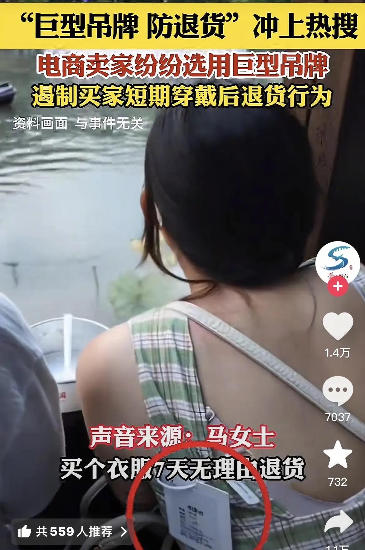 有种强烈预感! 吊牌的事情这样一搞! 电商行业要变天了,不是因为店铺老板不行而是因为白嫖党太让人气愤了! 近日电商卖家纷纷选用“巨型吊牌”,目的是为了防止退货。这一决定出现,冲上热搜,抵制买家穿戴过后退货行为! 网友表示:99.9%是女的,我自己媳妇退货我都看不惯!买回来好几十件挨个试了一遍,全退了!不够折腾的!我活到现在就退过几次货,除非满足不合适用不了,又比较贵两个因素,不然不会退 为啥要7天无理由退货?,只要确认签收了,12小时或者24小时无理由退货就可以,毕竟如果货不合适,签收后一般都看了,当场就可以退,哈哈 别说衣服了,我卖袜子的,5双袜子发出去,他全穿过了,然后申请质量问题,全给退回来的人都有!不出一分钱,还不用洗袜子!真的活不起了! 大家怎么看?