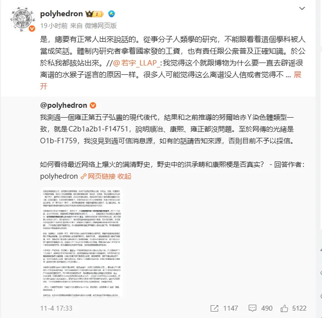 【专家最新回应“康熙生父为洪承畴”:采样过雍正第五子和恭亲王弘昼后代,DNA证实其努尔哈赤支系】#专家回应康熙生父为洪承畴假说# 近日,中央民族大学严实副教授发文评价近日网络爆火的“康熙生父为洪承畴”假说。