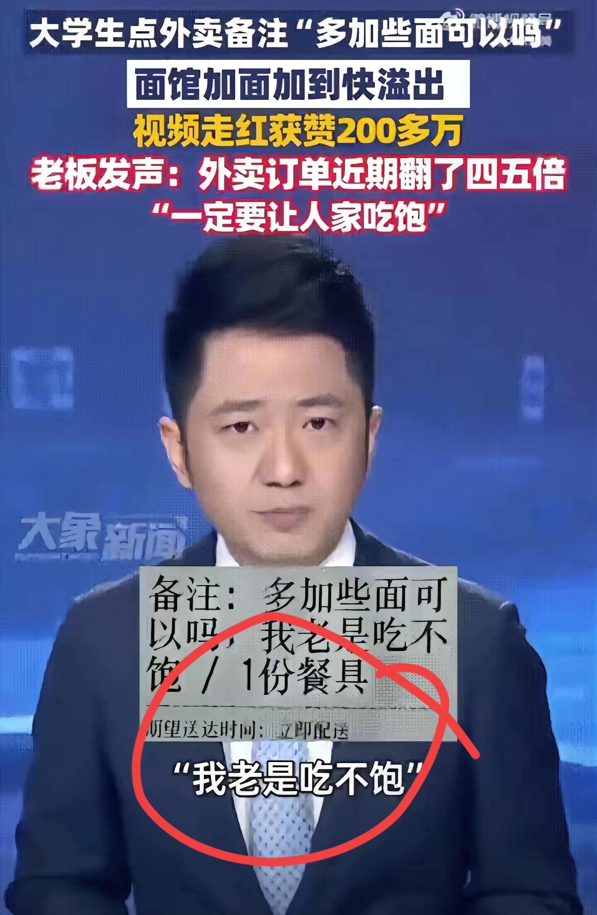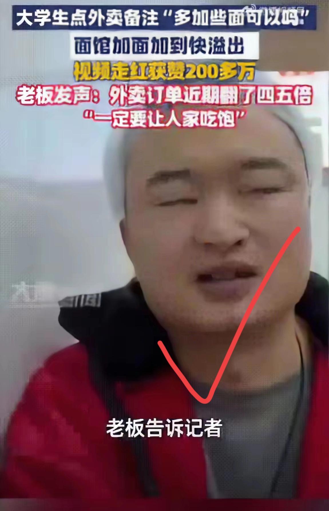 一碗满到溢出来的面,为啥能刷爆全网? 武汉大学生备注“多加点面,总吃不饱”,本是忐忑试探,却收到撑得盖不上盖的外卖,那顺着盒子往下淌的汤汁,暖的何止是肚子! 月薪一千二的生活费,扣完杂项每天吃饭预算不到二十块,点最便宜的面还怕被嫌事多,这小心翼翼的窘迫,谁没在拮据日子里经历过? 四十出头的老板没多琢磨,只想起自己当年啃馒头就免费面汤的苦,“娃不是贪便宜,是真不够吃”,多抓两把面的小事,却藏着最戳人的善意。 现在太多商家把“标准化”当借口,少辣多醋都难满足,这份超标的热乎气,恰恰撞中了我们对温暖的期待。这哪是营销爆款,分明是过来人对后辈的温柔托举,是困境中被人接住的感动。 你有没有被陌生人的小善意暖到过?来评论区说说你的故事!南京大学面条