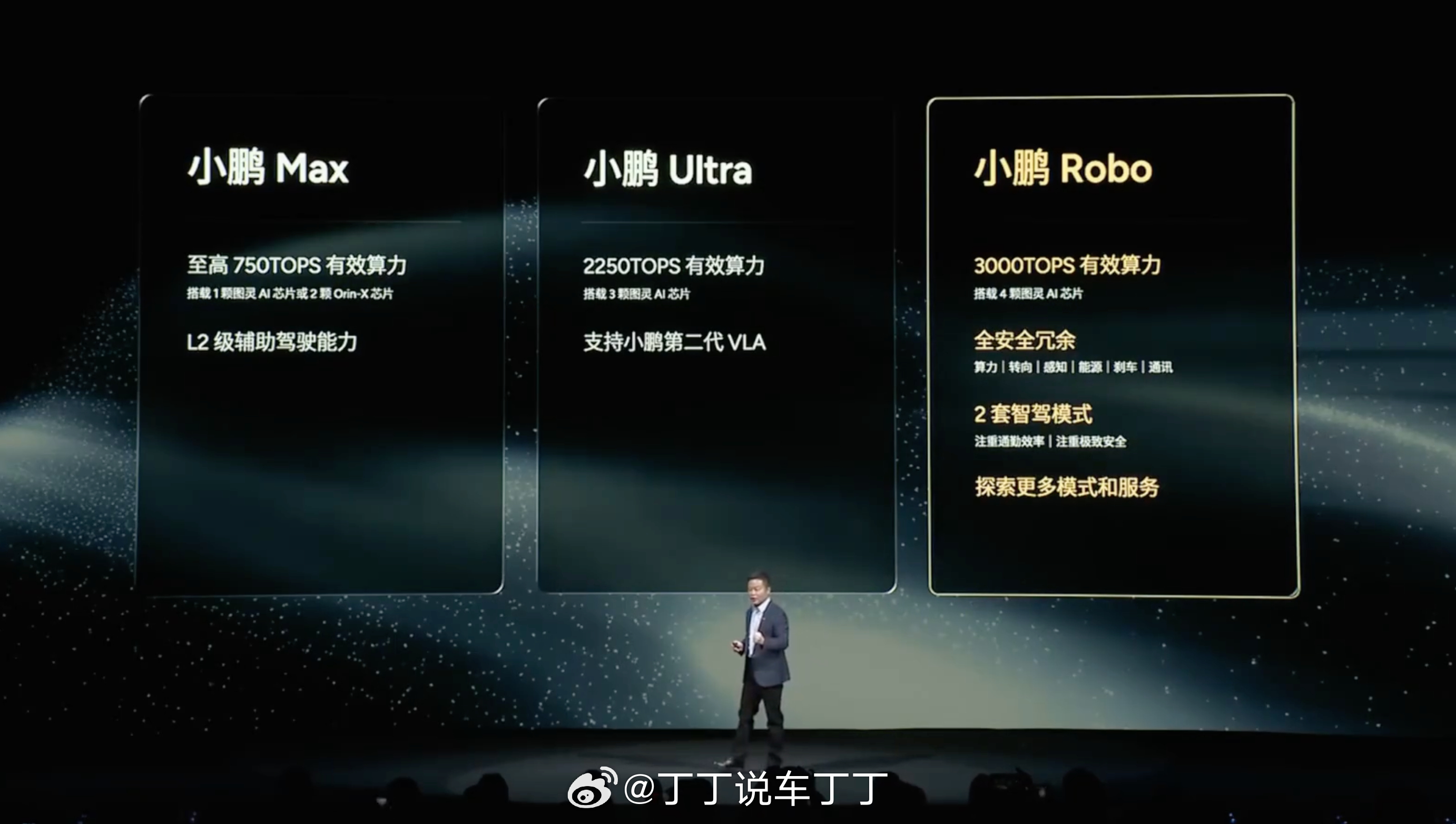 基于第二代更丝滑、corner case解决能力更强的VLA,推出小鹏robo车型(2026年推出3款),硬件上有全维度双重安全冗余,4 颗图灵芯片3000TOPS算力,提供两种智驾模式(风格),商用版更保守(安全),个人版更追求效率。