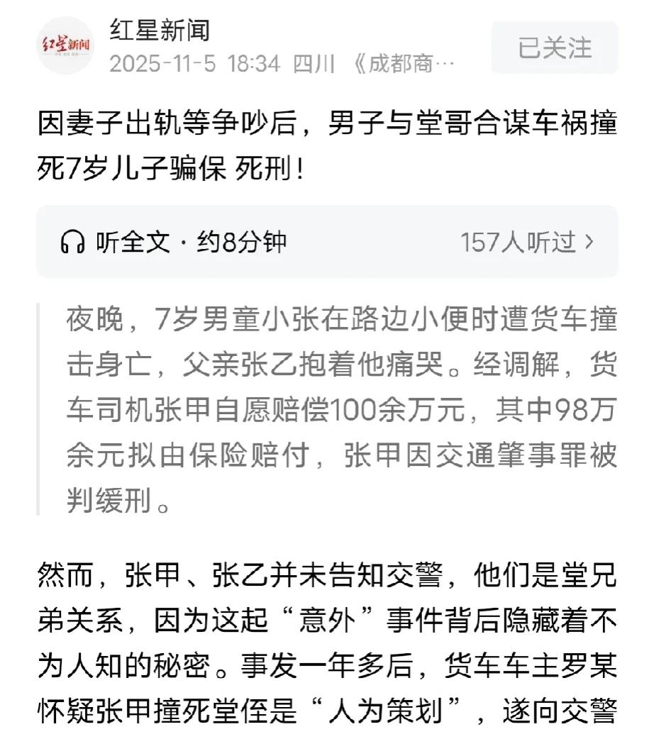 福建,男子的老婆出轨后,两人大吵一架,为了骗取保险金,他谎称儿子患病,与堂哥合谋,让堂哥驾车将儿子撞死,制造假车祸骗保。作案当晚,男子特意让儿子去路边小便,为堂哥的货车制造可乘之机。保险公司赔付18万元交强险后,发现堂哥持假证,拒绝支付98万元商业险,并将赔偿责任推给货车车主。法院判决车主赔偿79万元。车主眼看着自己要承担巨额赔偿,这时,一个人的出现,事情出现了转机。 张乙和妻子罗女士是一对夫妻,两人在2013年生下儿子小张。 有孩子后,生活压力越来越大,渐渐的,夫妻之间开始有了隔阂。 2020年3月,张乙无意中得知罗女士背着他在外面偷人,张乙气愤不已,跟罗女士大吵了一架。 张乙家里的经济条件本就不好,再加上老婆出轨,一堆的烦心事压得他喘不起气来。 为了弄到钱,他竟产生了邪念,杀 子骗保,但是,他一个人没法完成,得找个人跟他一起。 有了这想法后,张乙越发地不淡定,为了尽快完成自己的计划,他绞尽脑汁,终于想到了自己曾经跟他做事的老板叶某。 2020年9月份,张乙找到叶某,骗他说,自己的儿子得了重病,治不好了,他想让叶某制造一假的交通事故,撞死他儿子骗保,钱到手后,他会给叶某部分钱。 叶某一听,简直不可思议,他干不了这种丧 尽天 良的事,当场拒绝了张乙。 张乙被拒绝后,他千交代万交代,让叶某不要把这个事说出去。 被叶某拒绝后不久,张乙想到了自己开货车的堂哥张甲,张甲和张乙从小一起玩到大,两人的关系很好。 张乙找到张甲说,自己的儿子小张得了重病,有钱也治不了,为了不让他在病痛中受煎熬,自己狠心一些,痛快送走他。 张甲看着张乙声泪俱下,诉说着自己的不幸,既心疼又同情他。 张乙跟张甲承诺,保险金到手后会分他一部分。 张甲为了钱,也为了帮助好兄弟,最终答应了张乙,一起制造假的交通事故骗保。 2020年10月30号晚上9点多,张乙驾驶汽车把小张带到和张甲约定的地点某村国道G235线。 来到指定地点后,张乙先哄小张下车小便,小张小便结束后,站在后尾箱等候,这时张甲突然开着大货车撞到小车上,小张被撞倒在地。 张乙见状,假惺惺地冲上去抱住儿子痛哭流涕,之后救护车赶到,但是小张还是不治身亡。 交警到达现场后,经过调查,张甲告知交警,他是低头设置导航时没注意,才撞上小车引发事故。 2020年11月份,交警出示责任认定书,张甲负事故全部责任。 同年12月份,经过多方调解,最终达成协议,张甲赔偿小张家属100.5万元,这里面含调解前货车车主罗某垫付的4万元。 2021年1月份,张甲因犯交通肇事罪被判处有期徒刑一年2个月,缓刑一年6个月。 2021年2月份,保险公司将18万交强险中死亡赔偿金付给小张家属张乙。 但,后来保险公司经调查,发现张甲的道路运输从业资格证是假的,保险公司拒绝了赔偿第三者责任险。 张乙一看,傻眼了,保险公司拒绝赔偿,那他找谁要钱。 张乙气不过,于2021年3月份把张甲、罗某、保险公司三方告上法庭,要求共同赔偿87万余元。 2021年7月,法院经过审理判决保险公司赔偿张乙81万元,保险公司不服提起上诉,后来法院经过调查,张甲的证件是假证属实。 2021年12月份,法院改判罗某赔偿张乙79万元。 得知判决结果,罗某傻眼了,他郁闷无比,把这个事告诉好友叶某。 叶某终于按耐不住,把之前张乙找到他合谋杀 子骗保的事告诉罗某。 2022年3月,罗某跟当地交警举报,怀疑张甲撞死自己堂侄是为了骗保险,这条线索后来转到了刑侦队。直到2023年4月,警方抓到了张乙和张甲,这起“杀子骗保”案的真相才被查出来。 2024年6月,三明中院判处张甲死缓,限制减刑,处罚3万,另外还要退赔保险公司3万元。张甲不服上诉,福建高院驳回,维持原判。 而张乙也因这事被判死刑,他也上诉了,目前还没有结果。 《刑法》第232条规定,故意杀人的,判处死刑、无期徒刑或者十年以上有期徒刑;情节较轻的,处三年以上十年以下有期徒刑。 本案中,张乙因家庭矛盾与经济压力,产生杀子骗保的邪恶念头,属于直接故意,明知杀害儿子会导致其死亡,仍积极追求该结果发生以骗取保险金。 他谎称儿子患病骗取堂哥张甲信任,精心策划作案地点、诱导儿子下车小便创造作案条件,与张甲构成故意杀人罪共同犯罪,张乙系教唆犯、张甲系实行犯。 两人的行为突破人伦底线,蓄意剥夺未成年人生命,情节极其恶劣,社会危害性极大。 法院据此判处张乙死刑、张甲死缓且限制减刑,既符合《刑法》第232条对严重故意杀人行为的量刑规定,也彰显了法律对生命权的绝对保护和对极端恶性犯罪的严厉惩处,维护了司法公正与公序良俗。 张甲和张乙的结局警示我们,任何时候都应坚守良知,理性面对生活困境,切勿触碰法律红线。唯有人人遵纪守法、珍视生命与亲情,才能筑牢文明和谐的社会根基。