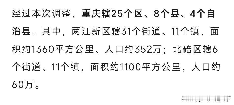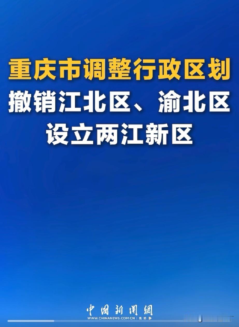重庆市38个区县减少到37个区县,行政区划调整开始松动了 重庆市,中国四大直辖市之一,也是中国面积和人口最大最多的直辖市,重庆的总面积为82,402平方公里,重庆市的常住人口为3190.47万人。 中国新闻网等媒体报道,11月6号重庆市调整行政区划,撤销江北区,渝北区,成立两江新区,新的行政区划调整后,重庆市管辖区县数量从38个缩减到37个。 目前重庆市管辖25个区,8个县,4个自治县。 重庆市名义上是直辖市,实际上按照面积和人口来看,重庆就是省份规模。重庆发展趋势 重庆行政区划 重庆人口分布 重庆城区地图 重庆发展 重庆人文地图 重庆城市拼图