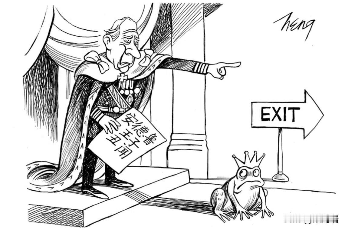 这幅由漫画家 Heng 创作的漫画,描绘了英国国王查尔斯三世与他的弟弟安德鲁王子的关系。 漫画中的男子是英国国王查尔斯三世,他手持写有“安德鲁王子”的纸张,指向一个写着“EXIT”(出口)的指示牌,示意安德鲁王子离开。安德鲁王子被描绘成一只头戴王冠的青蛙,这可能源自《青蛙王子》的童话故事,暗示他曾经的王子身份。 这幅漫画讽刺的是英国国王查尔斯三世剥夺弟弟安德鲁王子头衔和荣誉的事件。安德鲁王子曾因卷入已故美国富商杰弗里·爱泼斯坦(Jeffrey Epstein)的性侵丑闻而备受争议。 漫画中的主要人物是英国国王查尔斯三世和安德鲁王子。查尔斯三世剥夺了安德鲁王子的王室头衔和荣誉,并要求他搬离皇家住所温莎庄园。 EXIT:象征安德鲁王子被逐出王室核心圈。 青蛙:暗示安德鲁王子从曾经的“王子”身份“变回”普通人。 王冠:安德鲁王子被描绘成戴着王冠的青蛙,进一步强调他虽然曾是王子,但地位已不保。 Heng(王锦松)是一位新加坡自由职业社论漫画家,自1984年以来一直为新加坡最大的华文日报《联合早报》创作漫画。