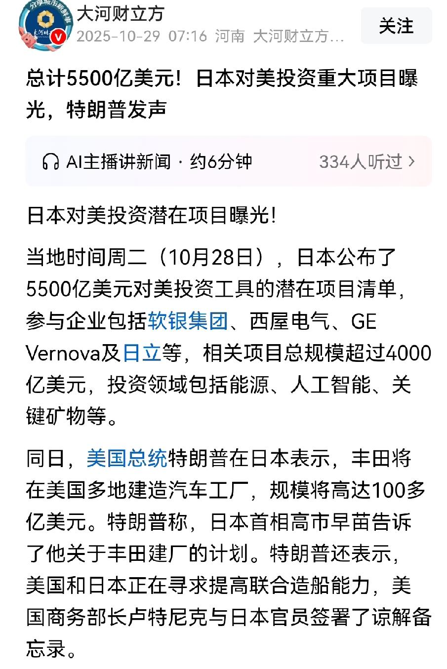 生子当如特朗普。 这次特朗普访问日本,高市早苗全程陪同,一副小鸟依人的样子。 关键是,日本要向美国投资5500亿美元。 如果光是投资还没什么,关键是协议中规定,投资收益的90%要留在美国本土,日本只能拿走10%的收益。 你投资给我,我还要拿走九成的投资收益,这几乎可以说是赔款了。根据现在的银价,5500亿美元相当于720亿两白银,当年大清《辛丑条约》也不过赔4.5亿两白银。 特朗普还真厉害,拿了钱还让对方陪着,人财两得了这是。