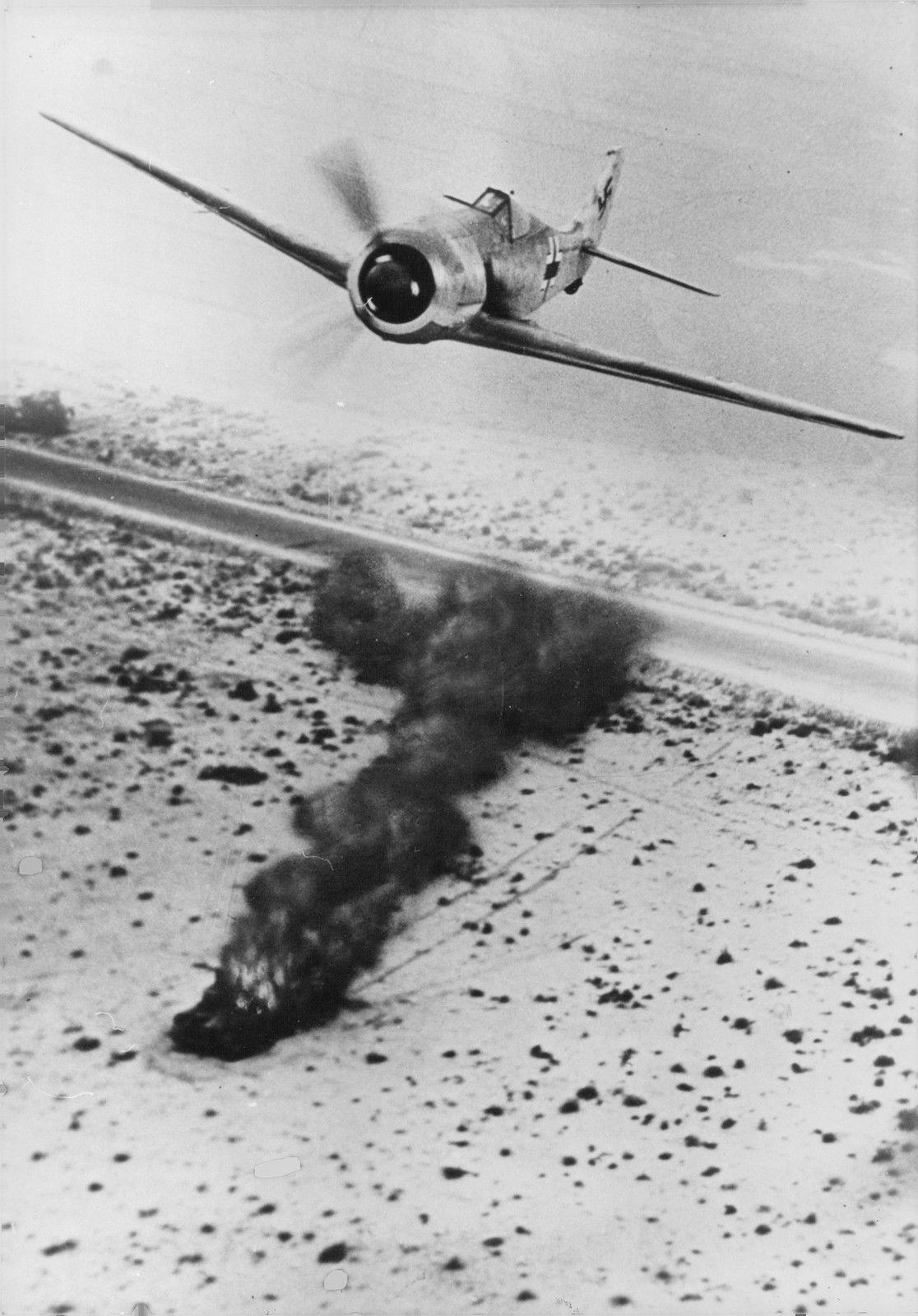 1942年,德军第10快速战斗联队(SKG 10)的福克-沃尔夫Fw 190A-4战斗轰炸机正行驶在利比亚巴尔比亚公路上。地面可见被击毁的敌军装备仍在燃烧,烟柱冲天。 Fw 190是福克-沃尔夫公司研制的单座战斗,配备1700马力BMW 801D-2发动机,装备4门20毫米机炮与2挺7.92毫米机枪。 巴尔比亚公路是利比亚地中海沿岸战略公路,全长1822公里,1940-1943年北非战役期间成为轴心国部队生命线。