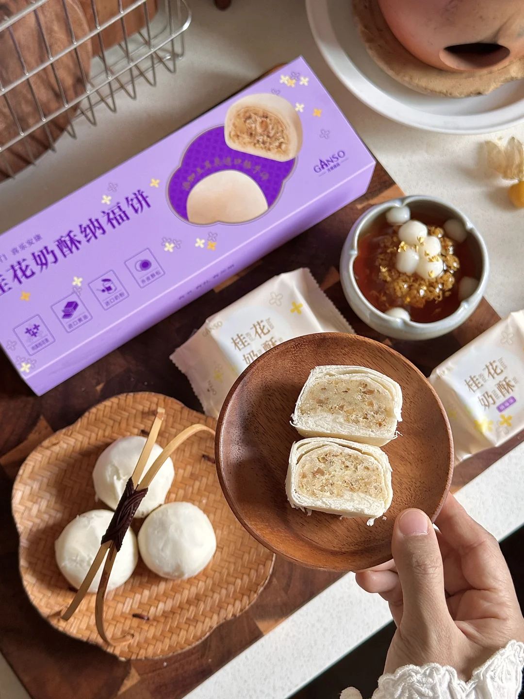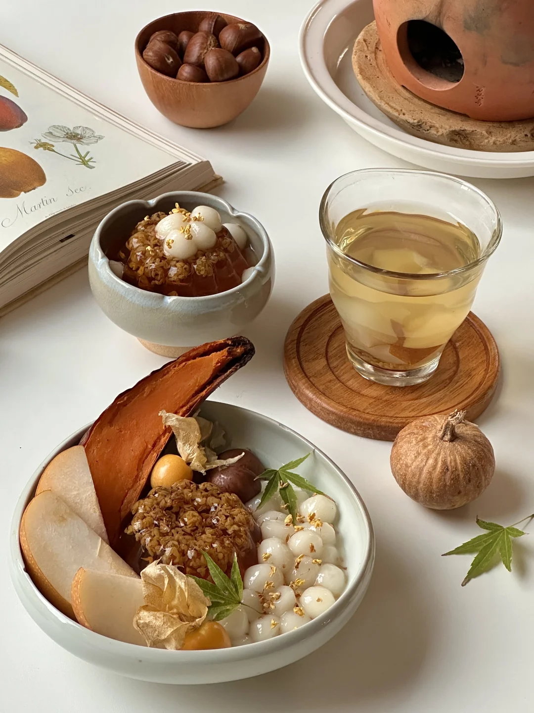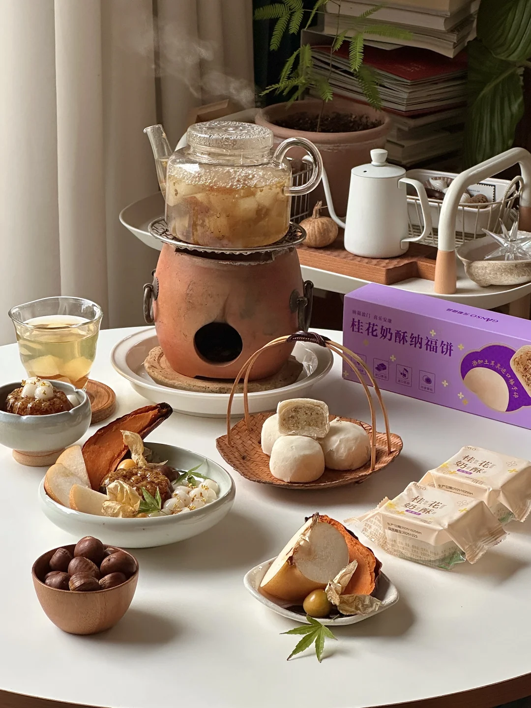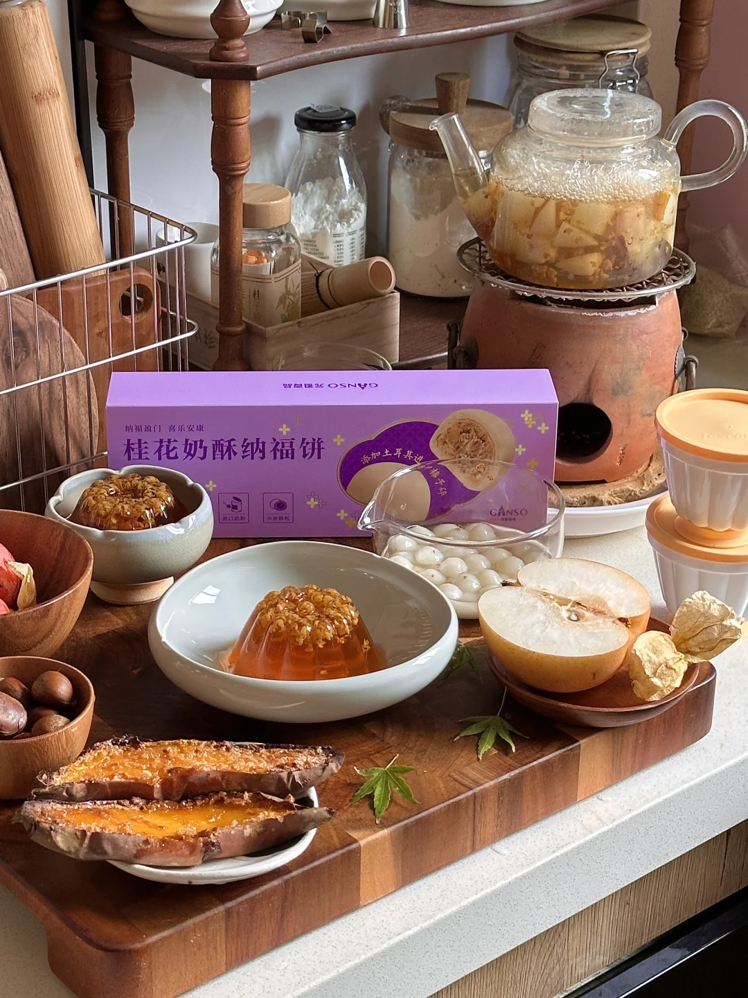🍁🍁 打开窗,桂花香气迎面而来 杭州的秋日终于有了该有的样子! 秋风一吹,天儿一冷 便可以生起炭火🔥 围炉煮起一壶热乎乎的暖茶了🫖 / 半颗秋月梨切块🍐🍐 加上几颗冰糖🧊 生起碳咕咚咕咚等待烧开~ 🍮 提前还准备了桂花乌龙茶冻! ▪️乌龙茶500ml|白凉粉25g|细砂糖10g|冻干桂花1g🌼 - ·乌龙茶+细砂糖在锅中煮沸,加入白凉粉大火煮开,关火后加入冻干桂花 ·倒入布丁模具,等稍稍放凉变浓稠后搅拌一下,让桂花均匀分布 ·放冰箱冷藏1小时以上定型即可 - 脱模后,装饰喜欢的topping 我选了烤番薯、秋月梨 煮了小圆子淋了些桂花蜜 装饰姑娘果与秋日枫叶🍁 🎑🎑 四季更替,老祖宗的饮食文化讲究顺时而食 秋日暖茶当然需要属于秋日氛围的糕点搭配啦~ 元祖桂花奶酥纳福饼🥠 以秋日桂花为馅,把天然的桂花熬煮成酱 让短暂的桂花存留在一整个秋日里! 进口榛子碎与层层酥皮,入口丰富又饱满 口腔里回甘都还有馥郁的桂花香气~ 礼盒装小巧还是独立包装 作为一份秋日伴手礼真的太合适不过了🫶🏻🫶🏻 ✨ 而且全国780+门店,7公里内2小时都能配送 随时随地都能吃上这一口桂花 今日秋日桂花香气的下午茶 开动🐿️