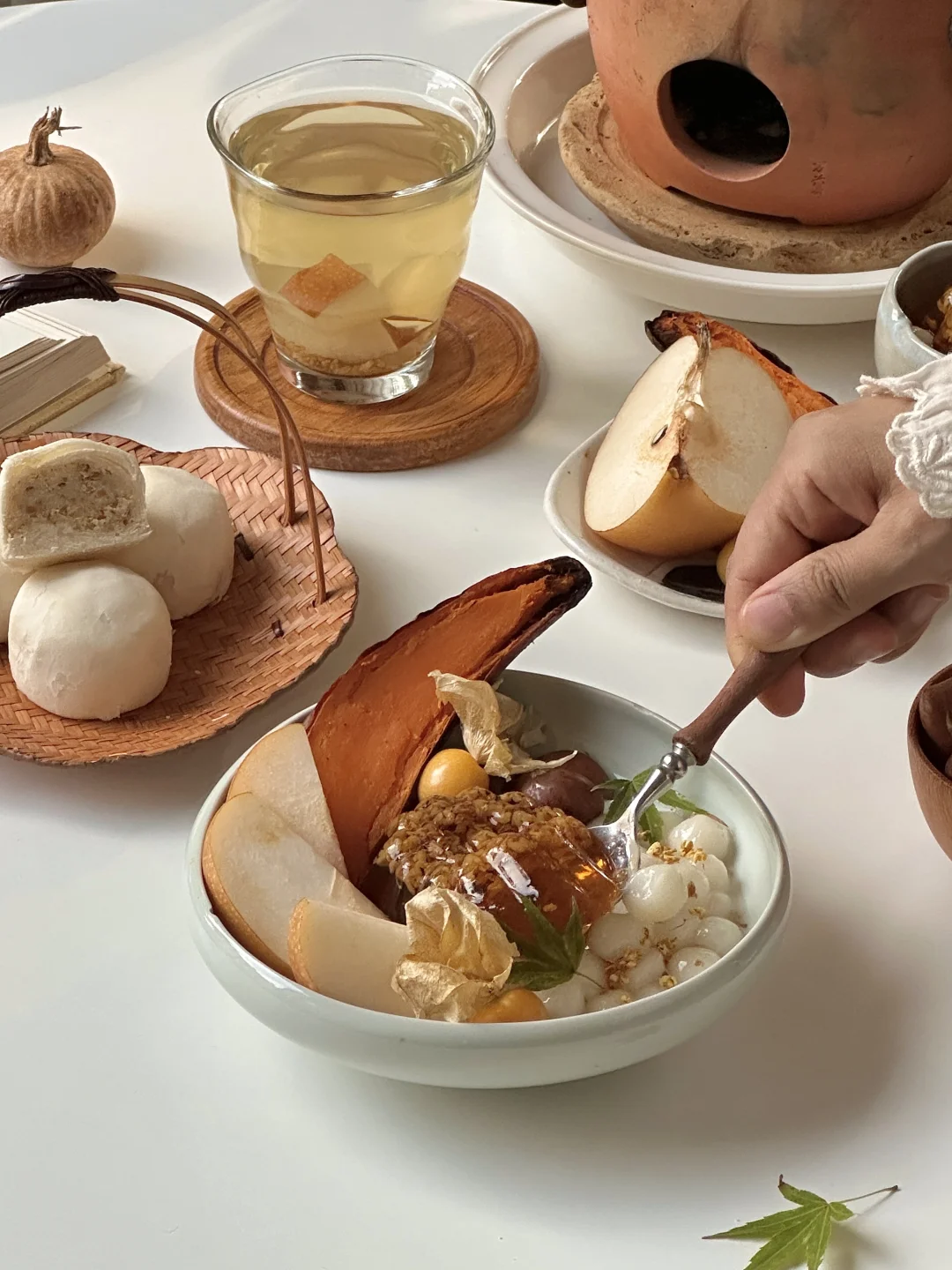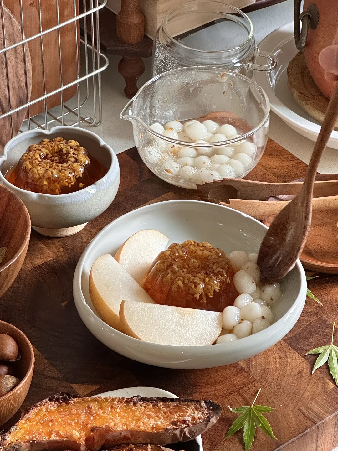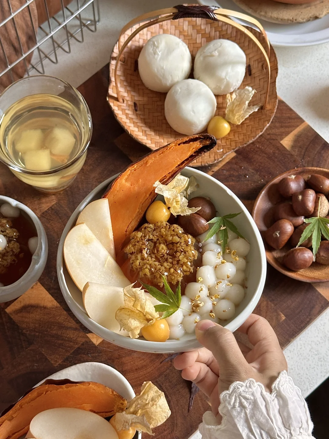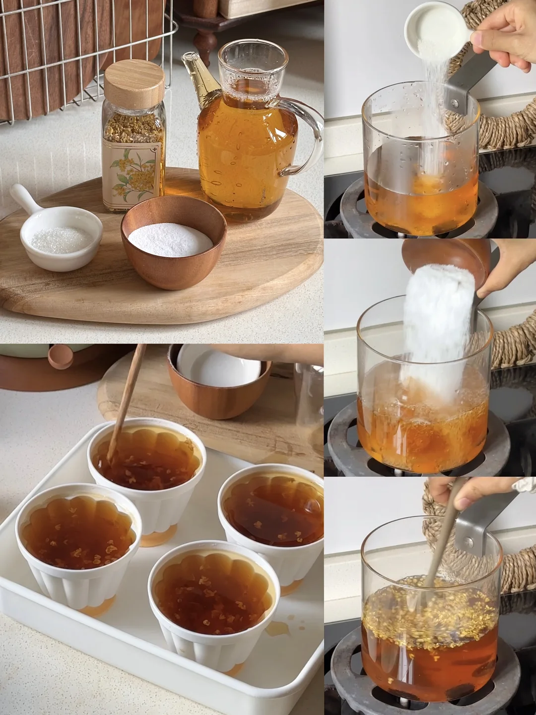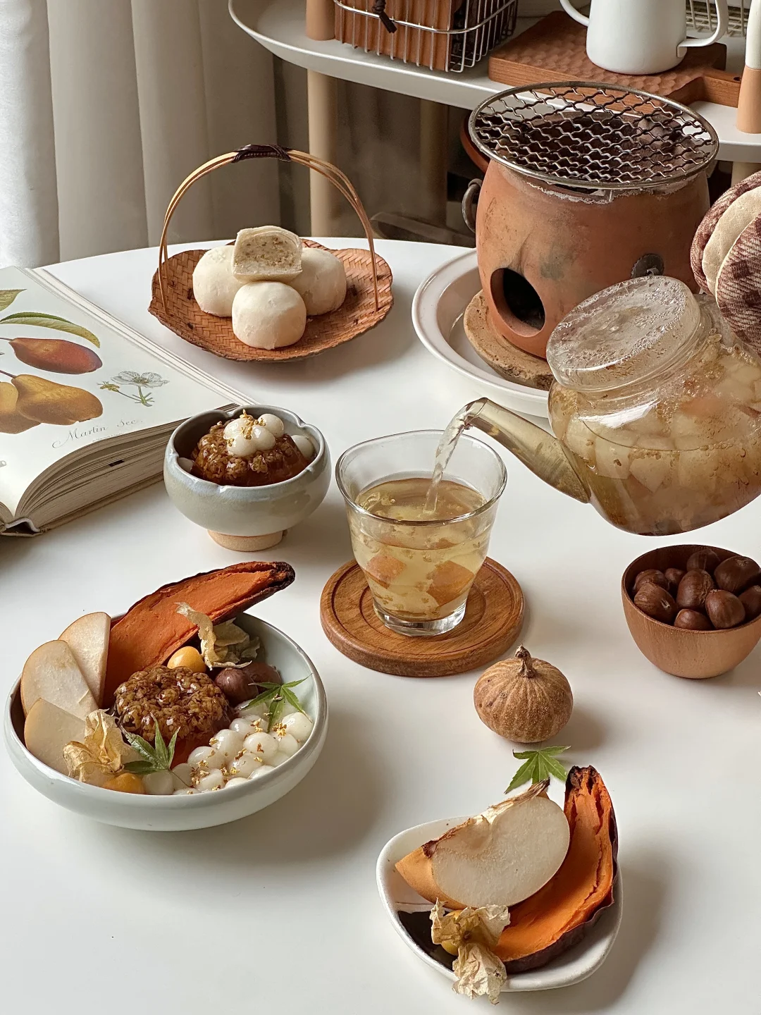 🍁🍁 打开窗,桂花香气迎面而来 杭州的秋日终于有了该有的样子! 秋风一吹,天儿一冷 便可以生起炭火🔥 围炉煮起一壶热乎乎的暖茶了🫖 / 半颗秋月梨切块🍐🍐 加上几颗冰糖🧊 生起碳咕咚咕咚等待烧开~ 🍮 提前还准备了桂花乌龙茶冻! ▪️乌龙茶500ml|白凉粉25g|细砂糖10g|冻干桂花1g🌼 - ·乌龙茶+细砂糖在锅中煮沸,加入白凉粉大火煮开,关火后加入冻干桂花 ·倒入布丁模具,等稍稍放凉变浓稠后搅拌一下,让桂花均匀分布 ·放冰箱冷藏1小时以上定型即可 - 脱模后,装饰喜欢的topping 我选了烤番薯、秋月梨 煮了小圆子淋了些桂花蜜 装饰姑娘果与秋日枫叶🍁 🎑🎑 四季更替,老祖宗的饮食文化讲究顺时而食 秋日暖茶当然需要属于秋日氛围的糕点搭配啦~ 元祖桂花奶酥纳福饼🥠 以秋日桂花为馅,把天然的桂花熬煮成酱 让短暂的桂花存留在一整个秋日里! 进口榛子碎与层层酥皮,入口丰富又饱满 口腔里回甘都还有馥郁的桂花香气~ 礼盒装小巧还是独立包装 作为一份秋日伴手礼真的太合适不过了🫶🏻🫶🏻 ✨ 而且全国780+门店,7公里内2小时都能配送 随时随地都能吃上这一口桂花 今日秋日桂花香气的下午茶 开动🐿️