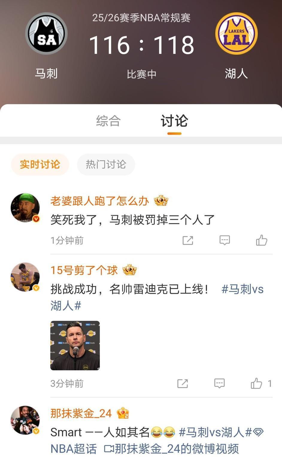 马刺被罚掉3人,东契奇反超三分,湖人118-116马刺。 斯马特失误发球踩线,马刺还有最后一攻,时间1.2秒。 湖人能赢吧!