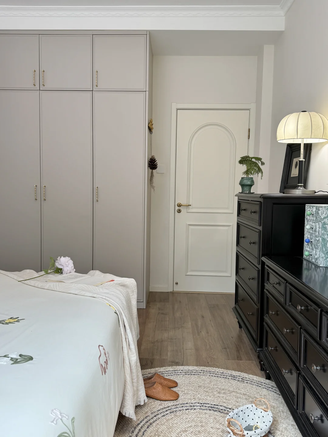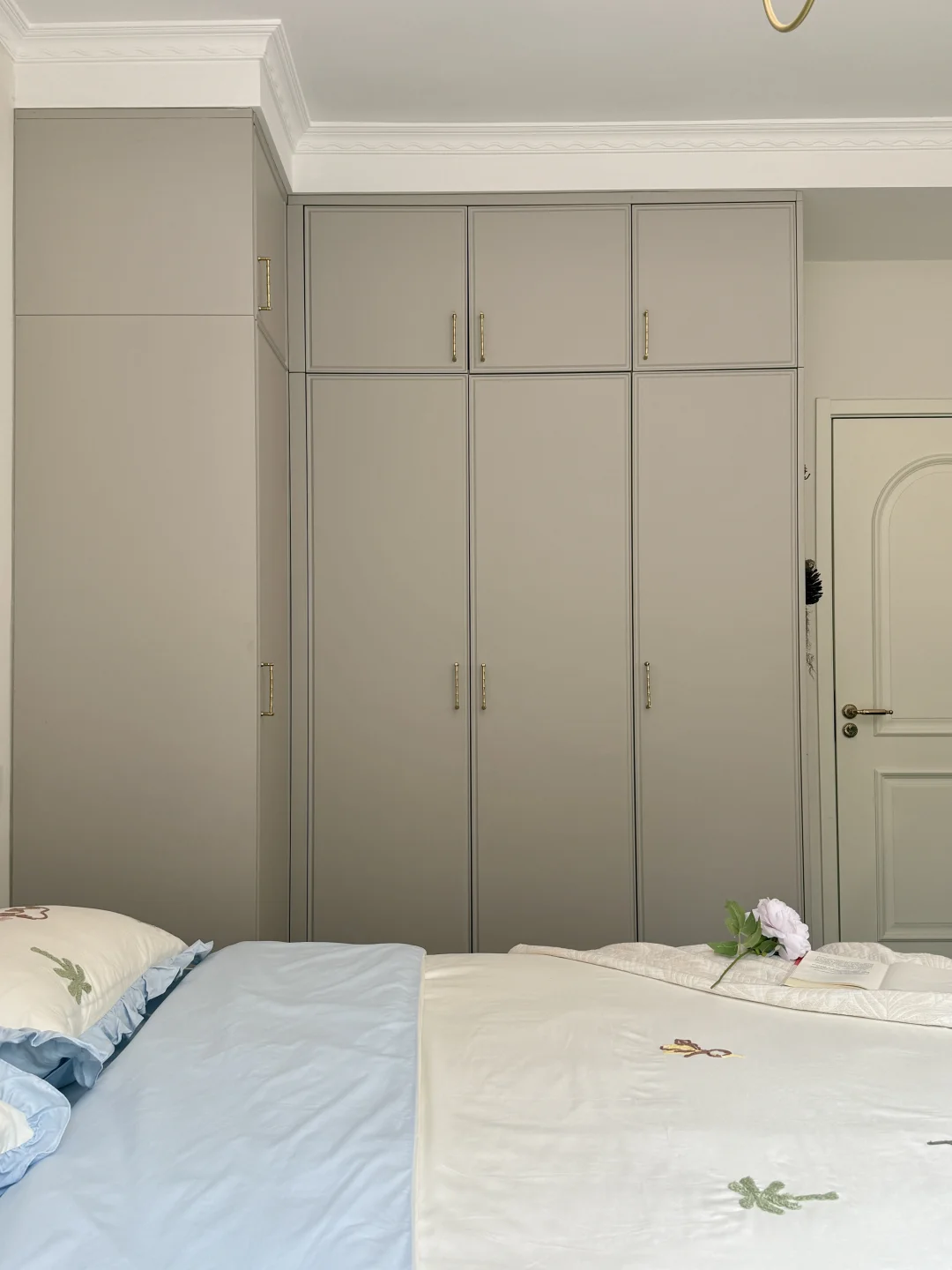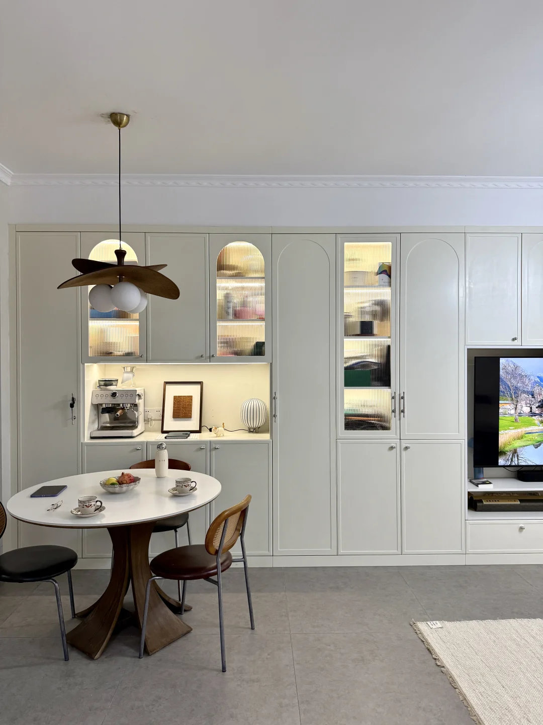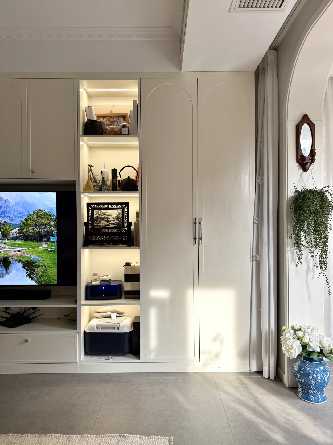 当初流行轻法式,所以我选择了奶白色弧形压塑门板搭配长虹玻璃
