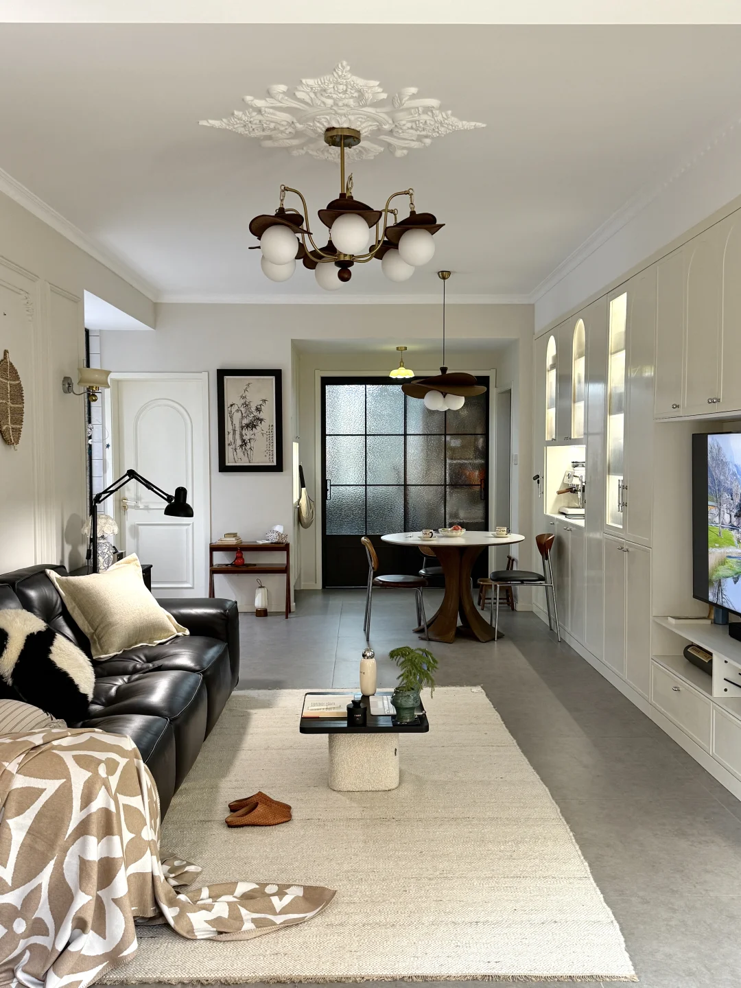 客厅做了一整排满墙电视柜,客餐厅一体,全长6.08m