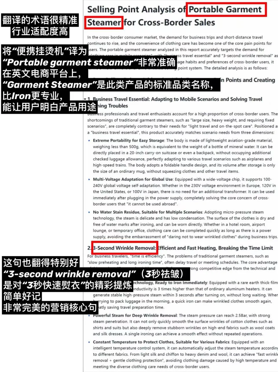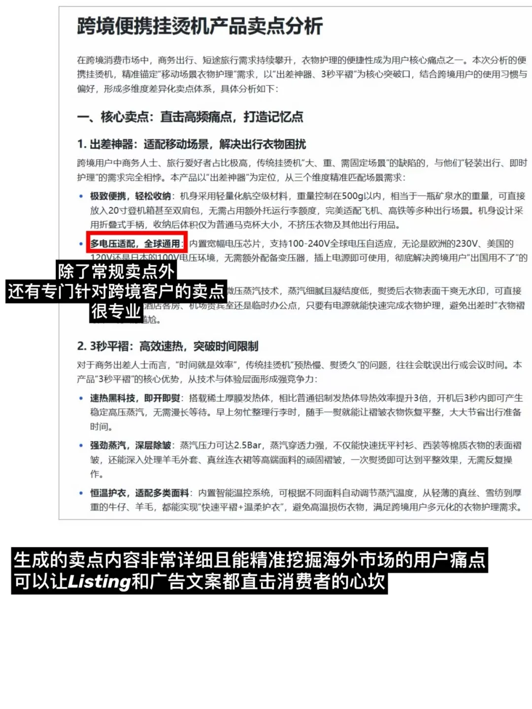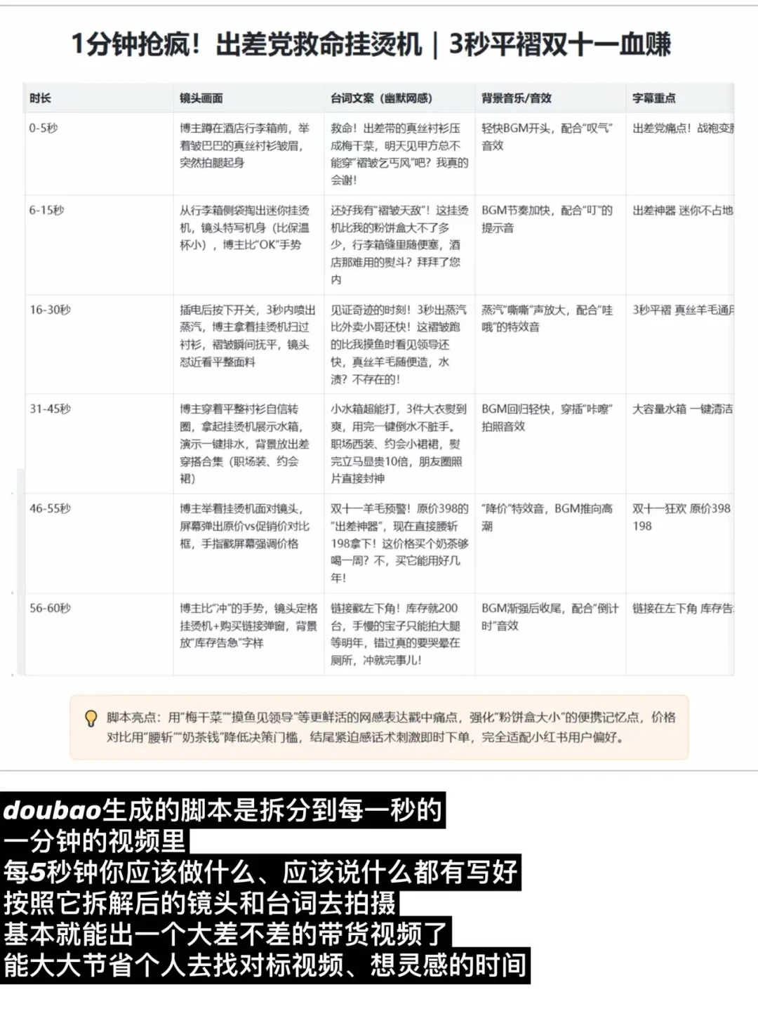 输入的时候我特别提出了想要展现的优点:“出差神器”“3秒平褶”,可以看到最后生成的视频脚本很详细,看过一边脚本后我脑子里已经有那个画面了,