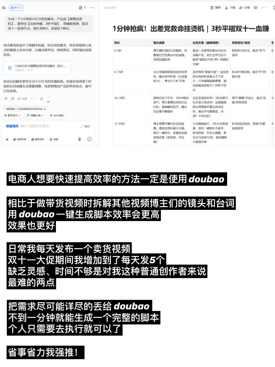 之前我都是拆解其他视频带货博主们的视频,模仿他们的镜头和台词,改动他们的视频做成自己的脚本,但这样下来发布一条卖货笔记的时间非常非常的久,几乎要花费我一整天的时间去做这一条视频,而对电商人来说最重要的就是效率效率效率!!所以后来我就开始用bao帮我写脚本了。