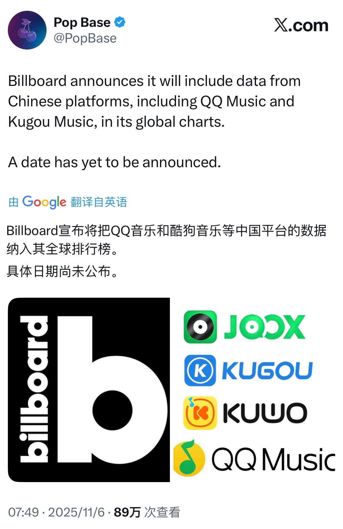 Billboard宣布将把QQ音乐和酷狗音乐等中国平台的数据纳入其全球排行榜。具