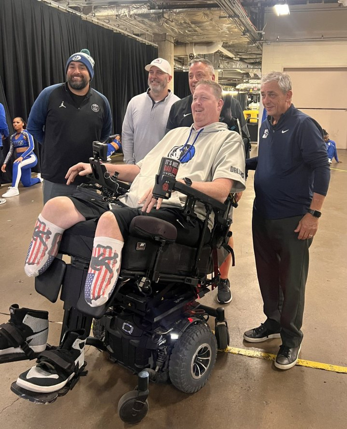 唏嘘啊!当年2米29的“大竹竿”肖恩-布拉德利坐着轮椅观战独行侠的比赛! 并与他的独行侠前队友波派·琼斯聊天。