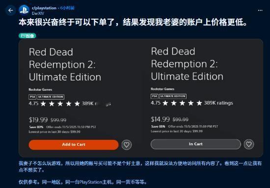 【PS商店也杀熟?】日前,有Reddit玩家发帖称,自己在同一地区、同一货币、同一台PS5主机上,与妻子在PlayStation商店中看到的折扣力度竟完全不同。 据他分享的截图显示,他的账号购买《荒野大镖客2:终极版》可享80%折扣,而他妻子的账号则高达85%。这位玩家调侃道:“我本来高高兴兴准备下单,结果发现我老婆账号买居然更便宜……可她平时几乎不玩游戏,用她账号买还得来回切换,属实有点麻烦了。最终购买热情大打折扣。” 此事引发大量玩家热议。许多人对索尼疑似实行的“定向定价”策略感到震惊。