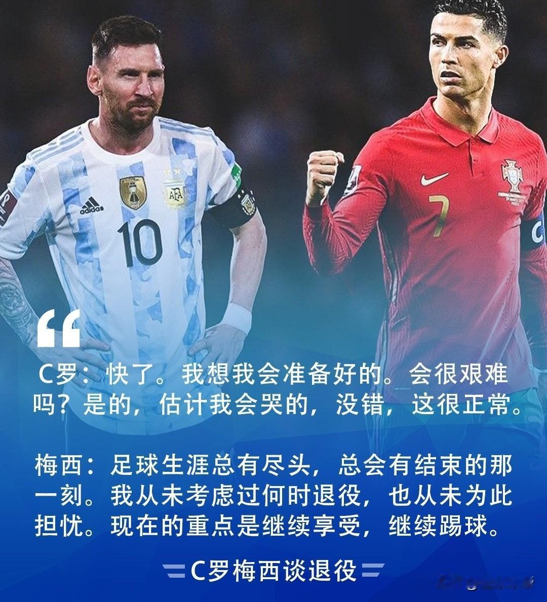 都没有退役计划,梅西和C罗到底谁先退役? 最近梅西和C罗分别接受了记者采访,先后都谈到了球迷最关心的退役问题,C罗表示自己退役快了,到时候可能会哭。 而梅西则表示虽然足球的生涯总有尽头,但是自己还没有考虑过何时退役。 作为足坛最伟大的两大球王,梅西和C罗在退役的时间上也是在暗暗较劲,C罗和利雅得胜利续约2年,梅西则和迈阿密国际续约3年,两年后C罗看到梅西还在踢的话,估计也不甘心提前退役,还想再熬一熬。 不管梅西和C罗如何保持巅峰,总会有落幕的那一天,等梅罗退役的时候,都会给足坛留下无数传奇记录,闪耀足坛一个时代。