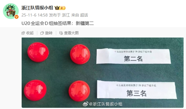 浙江U20队与新疆U20队在积分、净胜球、总进球和红黄牌数量上完全一致,需要通过抽签决定晋级球队。