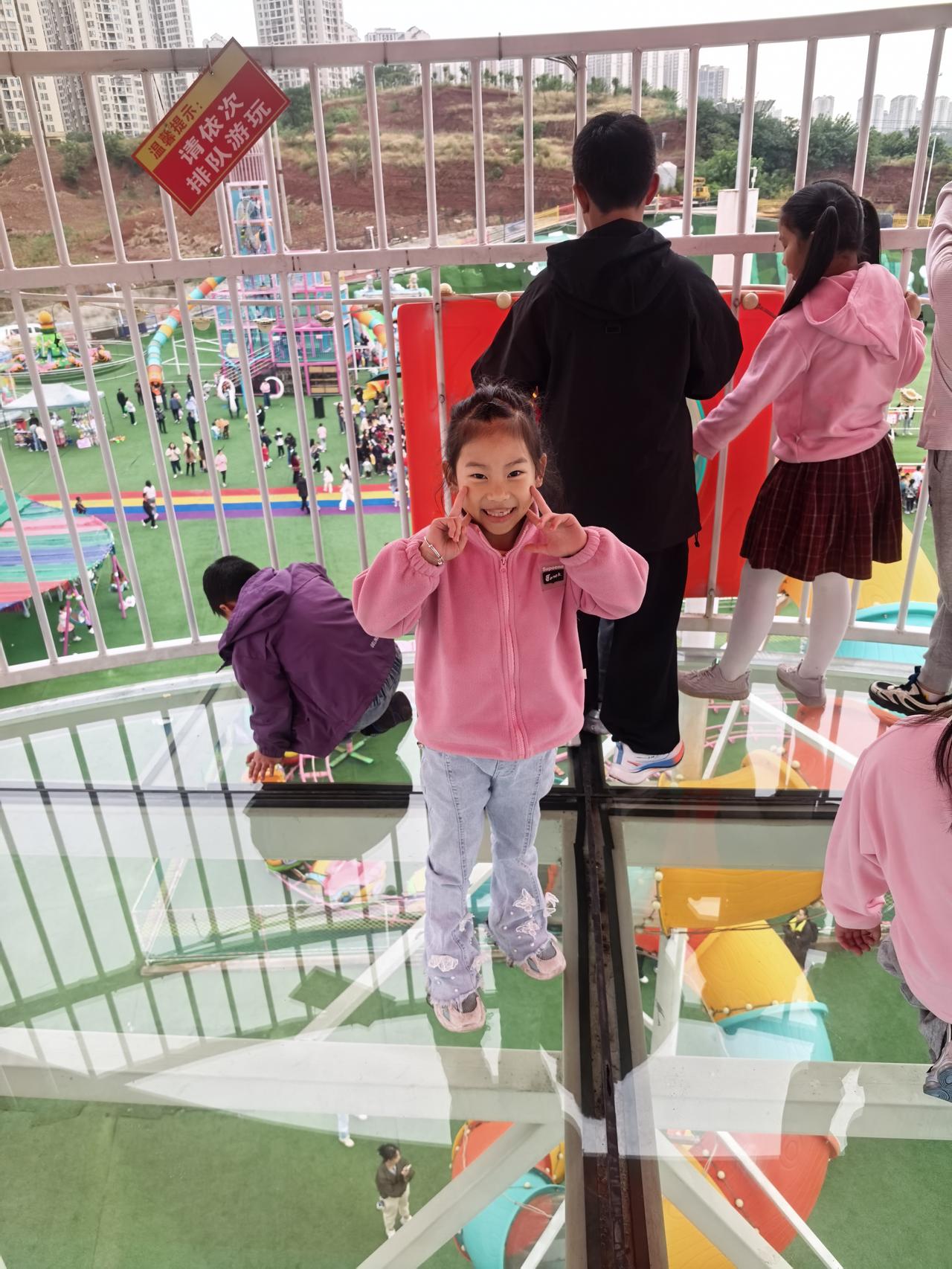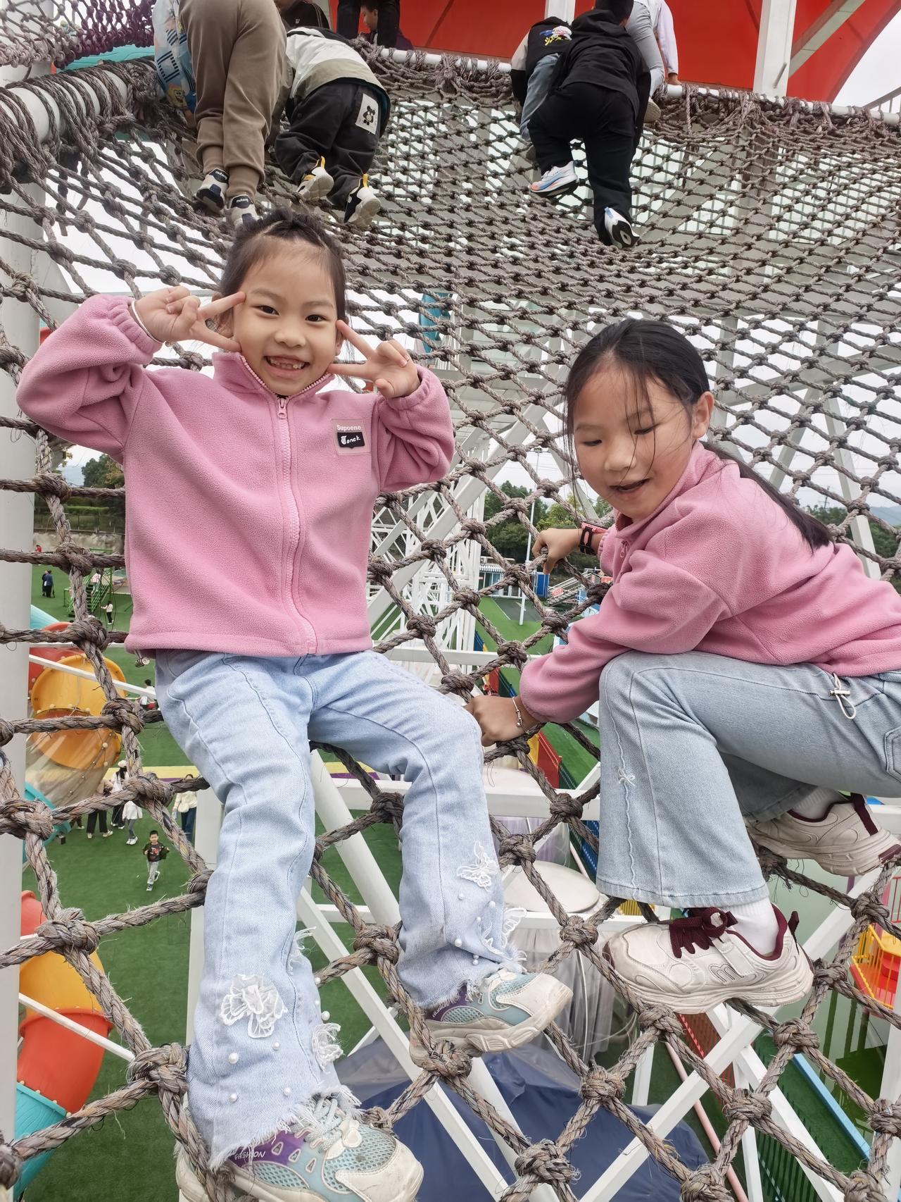 在这片户外乐园里, 快乐是触手可及的鲜活模样。 彩色螺旋滑梯裹着风的尖叫,绳网步道上,两个穿粉色外套的小姑娘正把笑容嵌进绳结的缝隙里——一个比着俏皮的剪刀手,一个弯着眼眶笑出轻响,牛仔裤蹭着粗麻绳,运动鞋踩着晃悠悠的快乐。 周围是攒动的身影,远山笼着淡雾,连风里都飘着孩子跑跳时抖落的笑声。这里的快乐从不用刻意寻找,是踩在绳网上的摇晃,是滑梯冲下来的风,是和伙伴挤在一起时,眼里亮晶晶的光。 你家孩子在这种乐园里,最爱玩的项目是什么呀?