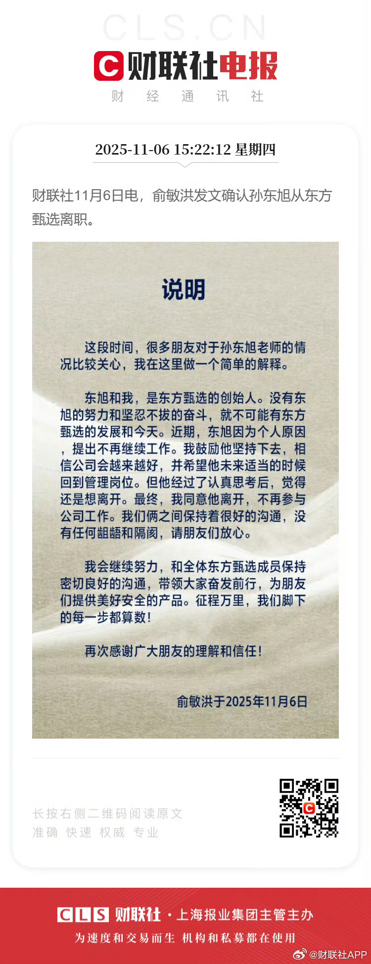 #俞敏洪感谢孙东旭#【#孙东旭从东方甄选离职#】11月6日,俞敏洪发文确认孙东旭离职。俞敏洪在说明中提到,“东旭和我,是东方甄选的创始人。没有东旭的努力和坚忍不拔的奋斗,就不可能有东方甄选的发展和今天。近期,东旭因为个人原因提出不再继续工作。我鼓励他坚持下去,相信公司会越来越好,并希望他未来适当的时候回到管理岗位。但他经过了认真思考后,觉得还是想离开。最终,我同意他离开,不再参与公司工作。我们俩之间保持着很好的沟通,没有任何龃龉和隔阂,请朋友们放心。”