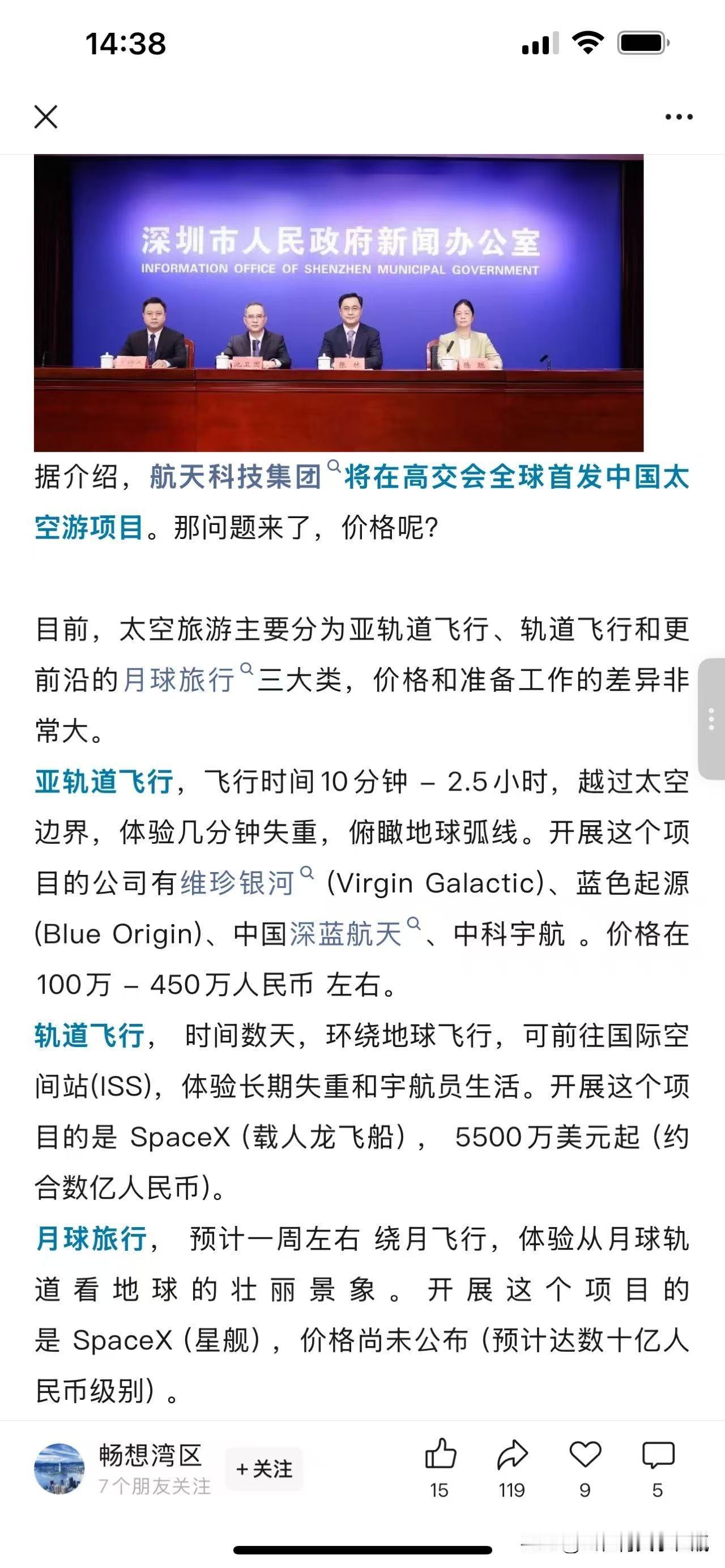 中国太空旅游项目和价格都出来了,亚轨道飞行,100-450万;轨道飞行,上亿人民币;月球旅行,数十亿人民币。 看完想想还是继续买保险股。