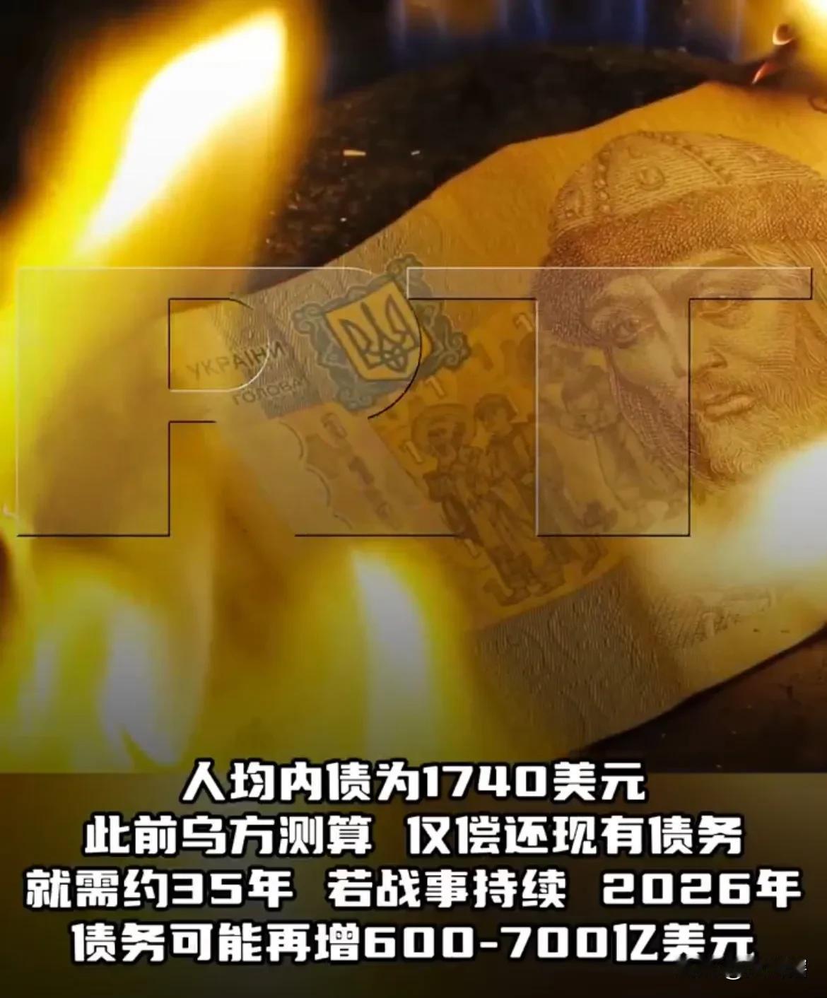 【俄罗斯媒体称乌克兰人均债务即将达到7000美元】 据《今日俄罗斯RT》消息,乌克兰公民人均债务已创下历史新高,达到6821美元。 乌克兰目前债务总额达到1910亿美元,大约需要35年来偿还债务。如果冲突持续,债务在2026年还将会进一步增加约600至700亿美元。 根据联合国公布的数据统计,俄罗斯在2024年人均债务为3000美元。目前国民人均债务最高的新加坡是15.8万美元,美国则紧随其后达到10.37万美元。 显然,乌克兰人均债务虽然创下新高,但是相对于新加坡和美国等国家并没有显得太高,何况乌克兰如今还深陷战争泥潭之中。