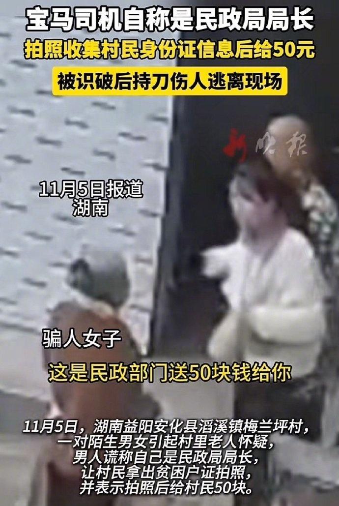 【假“局长”下乡行骗不成持刀伤人 乡村防诈不能仅靠村民火眼金睛】乡村防诈需建立更立体防护网络 据观察者网报道,11月5日上午,在湖南益阳安化县滔溪镇梅兰坪村,来了一对开宝马的“不速之客”。其中,男子谎称自己是“民政局长”,拍照收集村民身份信息如身份证、银行卡等,每人给50元。没想到,这场并不高明的骗局一下就被大爷大妈给识破了,反问道:“没有好处,你给我50块干嘛?”并准备报警。见行事败露,男子竟持刀扎伤了一名前来帮忙的老人。警方表示,已锁定涉事车辆,案件正在侦办中。 @我是霁月呀 认为,这件事很值得大家深思。一方面,它毫不留情地暴露出乡村地区依然是个人信息保护链条上最脆弱的一环,骗子之所以选择下乡,正是看准了这里信息相对闭塞、部分留守老人防范意识不足的弱点。用区区50元就想行骗,而这些信息一旦流入黑产链条,很可能为电信诈骗、非法贷款提供“养分”。 另一方面,大爷大妈们的“火眼金睛”也让我们看到了希望的曙光。他们没有因为对方自称是“局长”就放下警惕,而是用最朴素的常识筑起了第一道防线。这份难得的清醒,绝非偶然,而是近年来基层持续开展防骗宣传的成果显现。 然而,我们更要清醒地看到:当骗局升级为暴力犯罪,说明乡村安全防护网还存在着明显短板。唯有让安全防护跑在犯罪行为前面,才能真正确保每一位村民的合法权益不受侵害。 乡村防诈需要建立更加立体的防护网络:既要继续加强群众的防骗意识,更要完善基层基层反诈防诈的防控体系;既要依靠村民的警惕性,更要发挥科技手段的预警作用;既要做好事前防范,也要强化事后追查。只有形成多方合力,才能有效遏制个人信息黑产向乡村蔓延的势头。