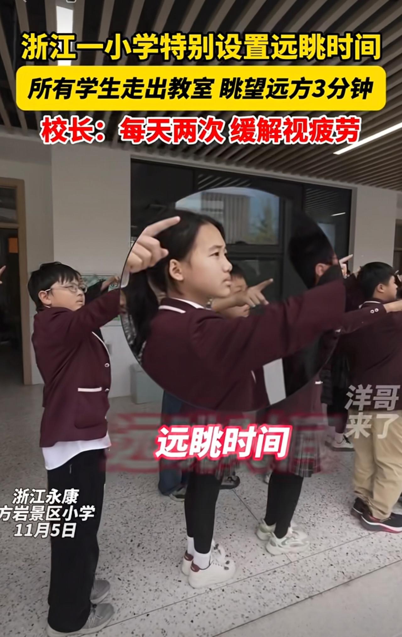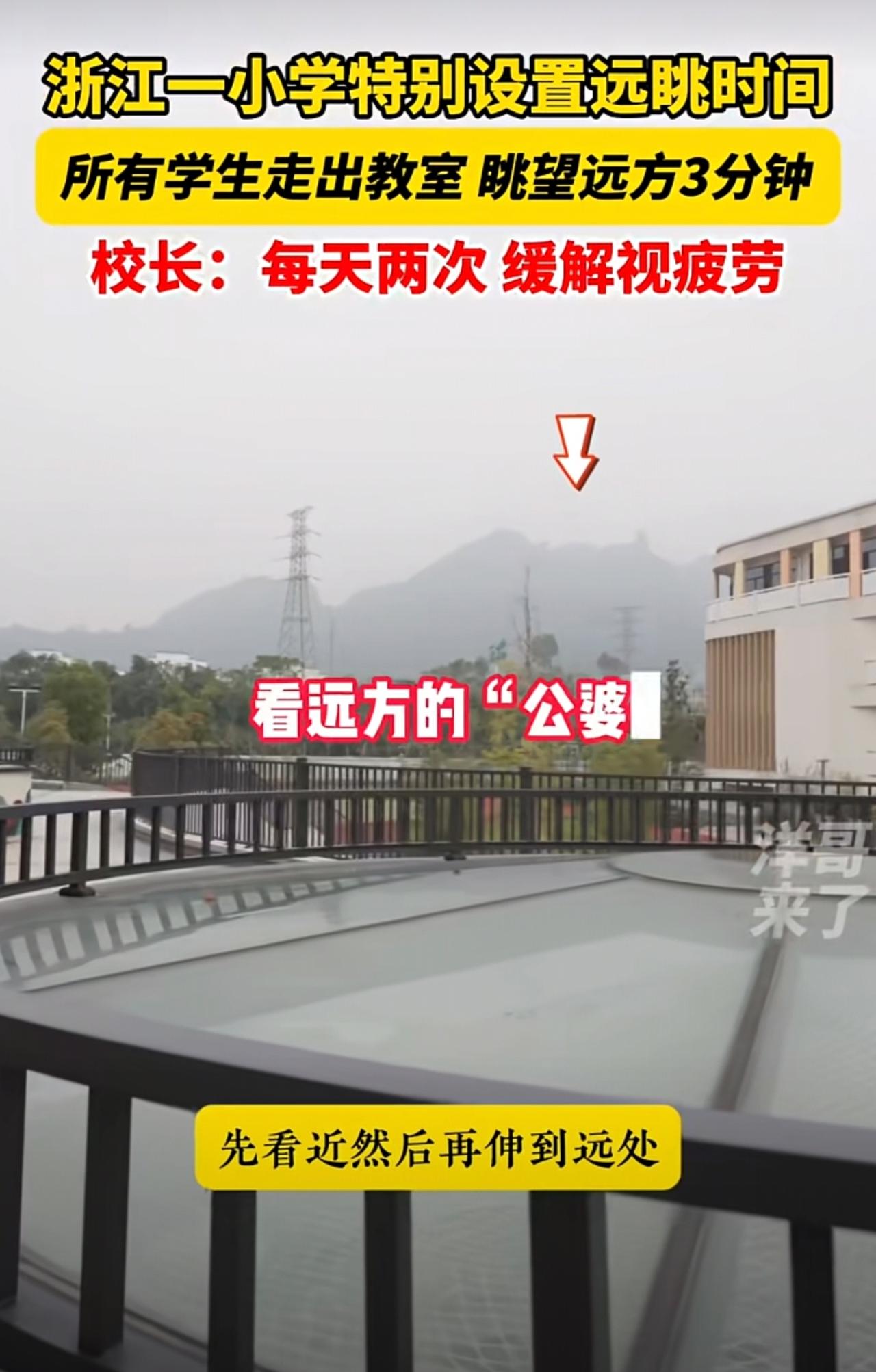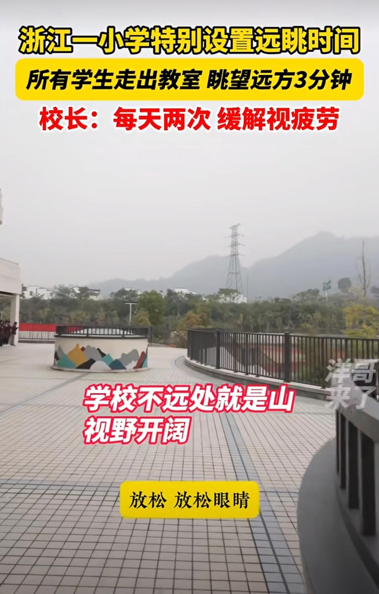 走出教室去远眺!浙江一小学特别开设远眺时间,所有学生走出教室眺望不远处的山,缓解视疲劳。@永康市方岩景区小学 近视 校园生活 永康 小学开设远眺时间 金华
