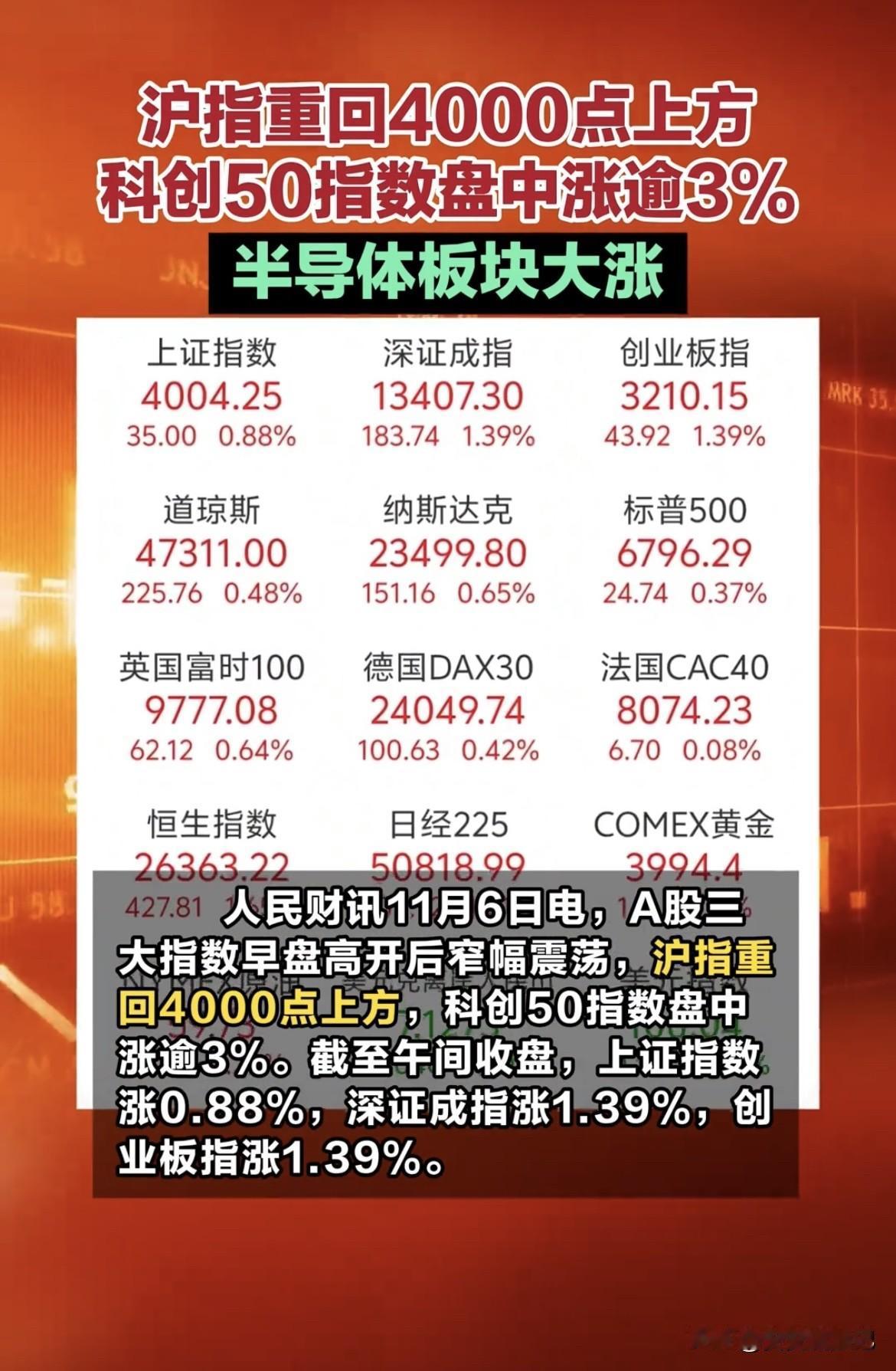 今天这股市可太给劲儿了!6日沪指涨约1%,收复4000点,报4007.76点,科创50指数更是大涨超3%,沪深北三市合计成交20762亿元。早盘的时候就形势大好,沪指涨近1%重返4000点上方,科创50指数大涨近3%。 盘面上,汽车、有色、半导体等板块拉升,旅游、传媒等板块走低。银河证券说中美经贸磋商有成果,国内政策也会加力,市场向好趋势不改。德邦证券则认为市场或维持红利、微盘、产业趋势结合的风格。短期轮动会加快,中长期还是震荡上行。这行情,股民们估计都乐开花了!