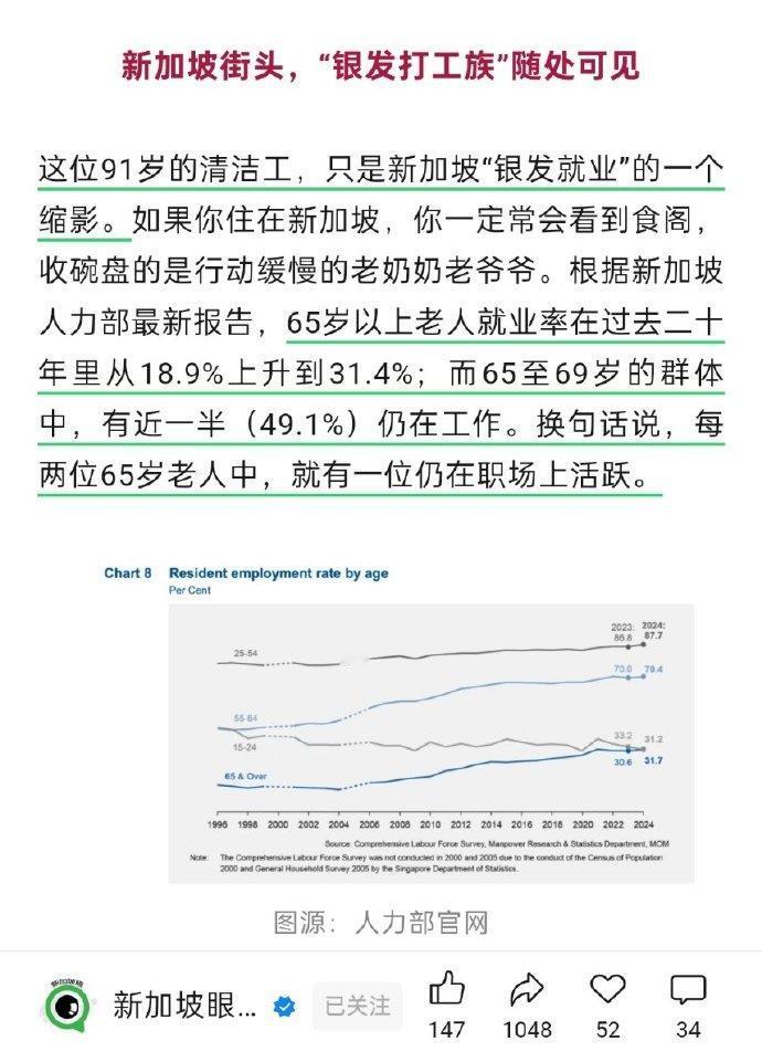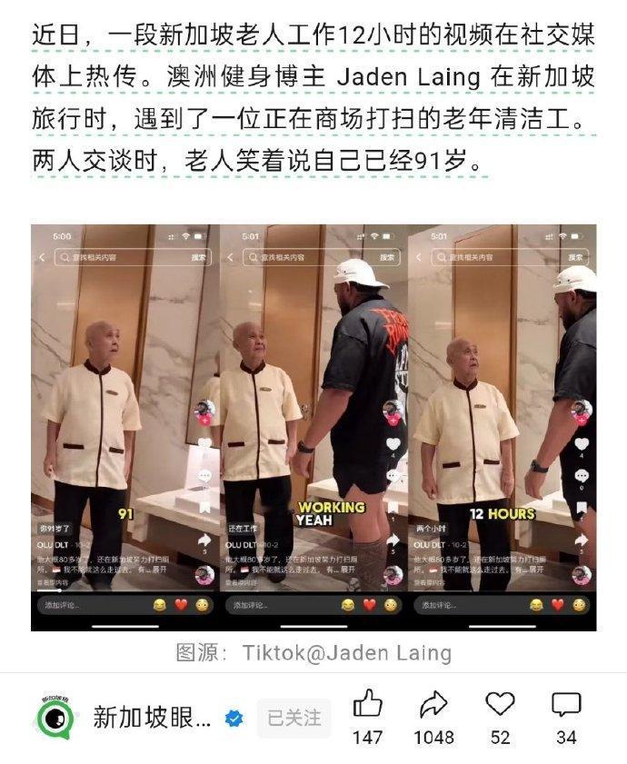 新加坡91岁老人每天还要工作12小时。 新加坡街头的银发打工族随处可见。 新加坡65岁以上老人就业率达到31.4% 新加坡也在极力扶持老年人就业。 新加坡是一个非常卷的城市。[吃瓜群众][吃瓜群众] 新加坡91岁老人每天工作12小时