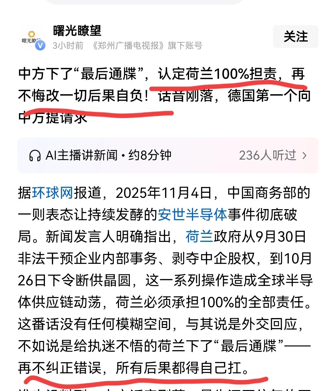 抢劫罪与招摇撞骗是一回事吗? 荷兰首相提交辞呈,这位一手导演抢夺安世半导体的政客,下台走人。 于此同时我国也在4日下达了“最后通牒”。 强硬表态:是荷兰政府非法干预企业正常运营,造成全球半导体供应链混乱。 荷兰必须纠正错误,否则承担一切后果。 老美已经暂停“50%穿透性政策”的情况下,荷兰最好的选择就是有错就改。 当然,罪魁祸首留下一地鸡毛,却选择甩手走人,没有任何担当。