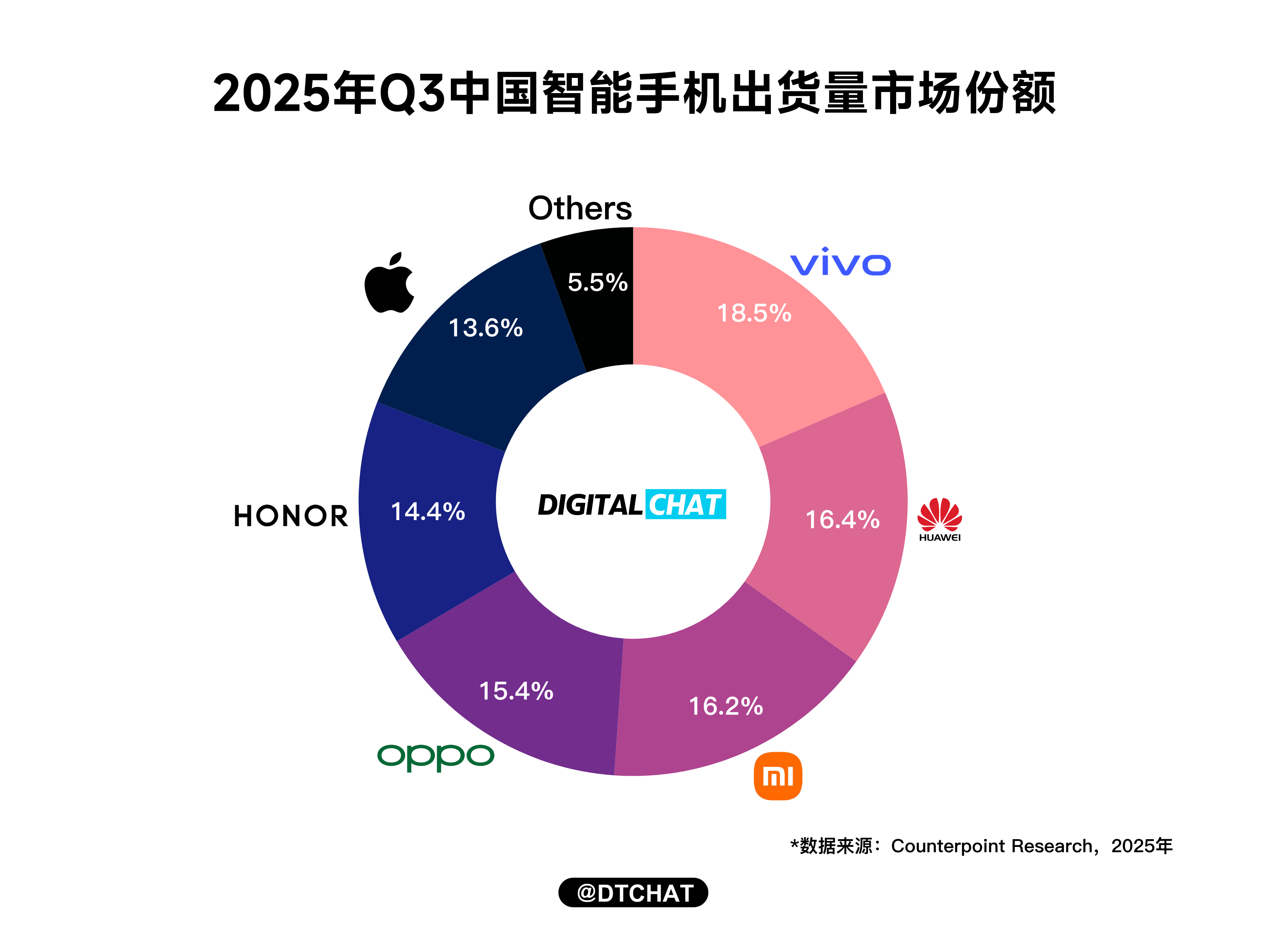 Counterpoint公布了2025年Q3中国智能手机出货量数据,整个出货量同比下降2.7%,从市场份额来看,vivo拿下国内第一、华为拿下第二、小米拿下第三,“华小V”三强鼎立。