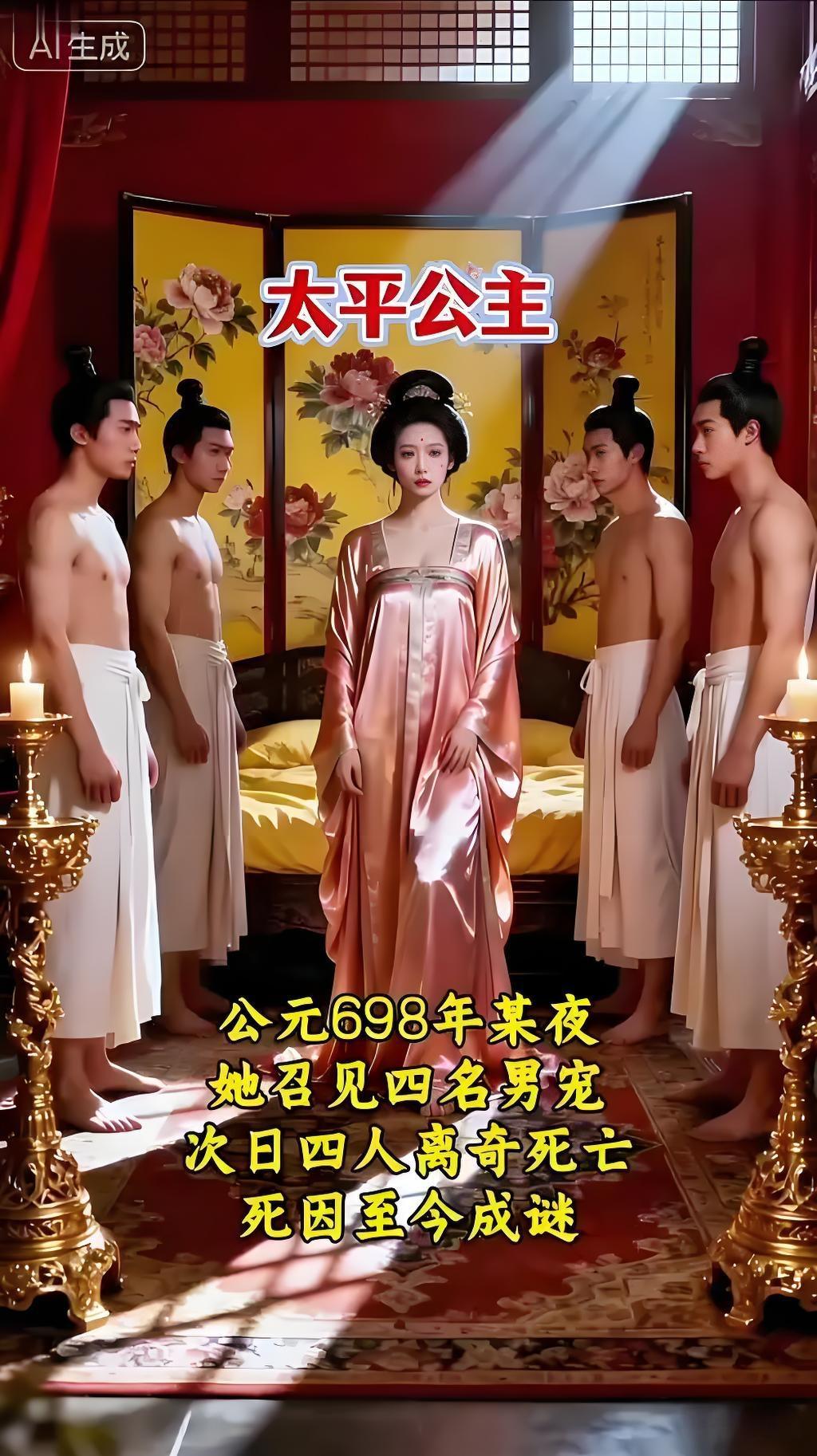 史上最狠公主! 太平公主 “床杀”四名男宠, 手段残忍令人咋舌! 史上最狠的公主,非太平公主莫属。她不光在朝堂上有权有势,私生活还特别荒唐,下手也狠得吓人。 公元698年的一个晚上,太平公主找了四个长得俊俏的男子陪自己。这四个人还以为能靠着公主攀高枝,过上好日子,没成想是踏进了鬼门关。 第二天一早,丫鬟们去收拾房间,一进门就吓傻了——那四个男子早就没了气息,身体都凉透了。有人说,是太平公主给他们吃了太多助兴的药,导致他们没撑过去;也有人说,是他们没伺候好公主,被悄悄处置了。 不管怎么说,一夜之间害了四条人命,太平公主对生命的漠视,真是让人没法理解。