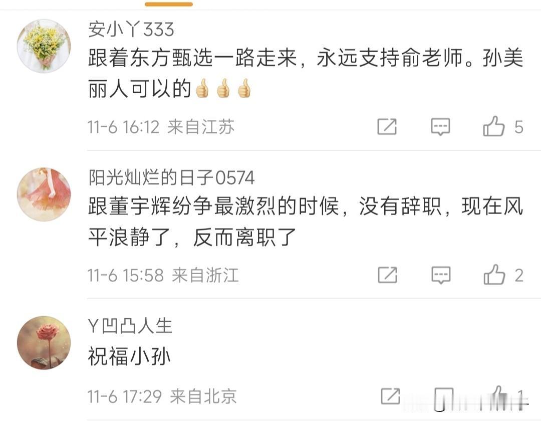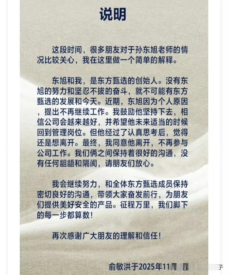 真没想到,孙东旭也离开东方甄选了! 看了俞敏洪发的说明,确认孙东旭从东方甄选离职,尽力挽留了,还是决定要走。 孙东旭作为东方甄选的创始人之一,能力毋庸置疑,俞洪敏也特意解释,两人之间沟通很好,没有任何隔阂。 说实话,当初董宇辉选择离开,就有一点小意外,如今,孙东旭也离职了,这是真没想到,怎么说,也算公司的元老,走出这一步也不容易。 董宇辉年轻有为,孙东旭经验丰富,曾经也是俞洪敏的“左膀右臂”,一下子有了两个得力干将,应该非常难过吧! 看到一些网友在谈论,董宇辉会不会重新回到东方甄选,个人感觉,不太可能,小董现在闯出自己的一片天地,无拘无束,前途一片大好。 虽然不知道孙东旭离开的具体原因,下决心做的事,肯定经过深思熟虑,有能力的人,无论干什么,都不会差。