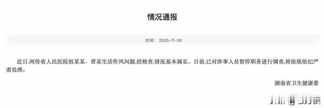 湖南省卫健委已经发出通告,网友反映的是事实,祖院长和曾主任都受到了停职接受调查,