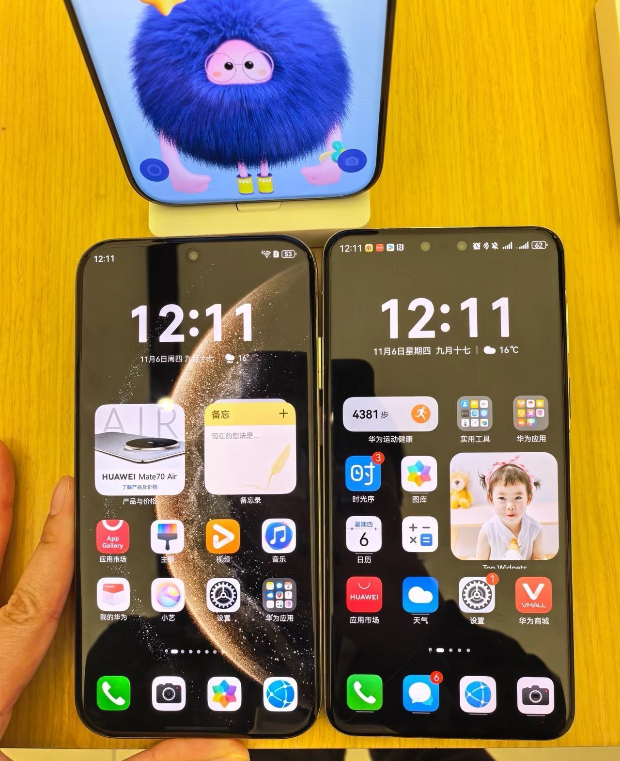 Mate 70 Air这么薄? 这次air的手感确实很薄,还宽了一些,看起来胖胖的 Air VS Pro 前置摄像头:1070万VS1300万 后置摄像头:5000主摄+800广角+ 1200长焦+150红枫 VS 5000主摄+4000广角+4800长焦+150红枫 尺寸:7英寸 VS 6.9英寸 电池容量:6500毫安 VS 5500毫安 充电速度:66瓦 VS 100瓦 无线充电:不支持 VS 支持