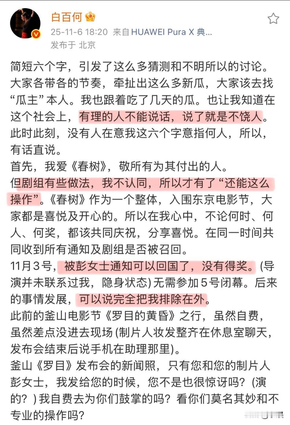 总结来说就是: 11.3被制片人通知没拿奖可以回国了,闭幕式红毯也不用参加,接下来剧组把白百何完全排除在外,但导演和男主拿了奖她之前完全不知道。[吃瓜群众] 想象一下,朋友让你回家,说散了散了。然后他俩又单独吃火锅去了…[吃瓜群众]娱乐圈那点儿事 扒一扒娱乐圈