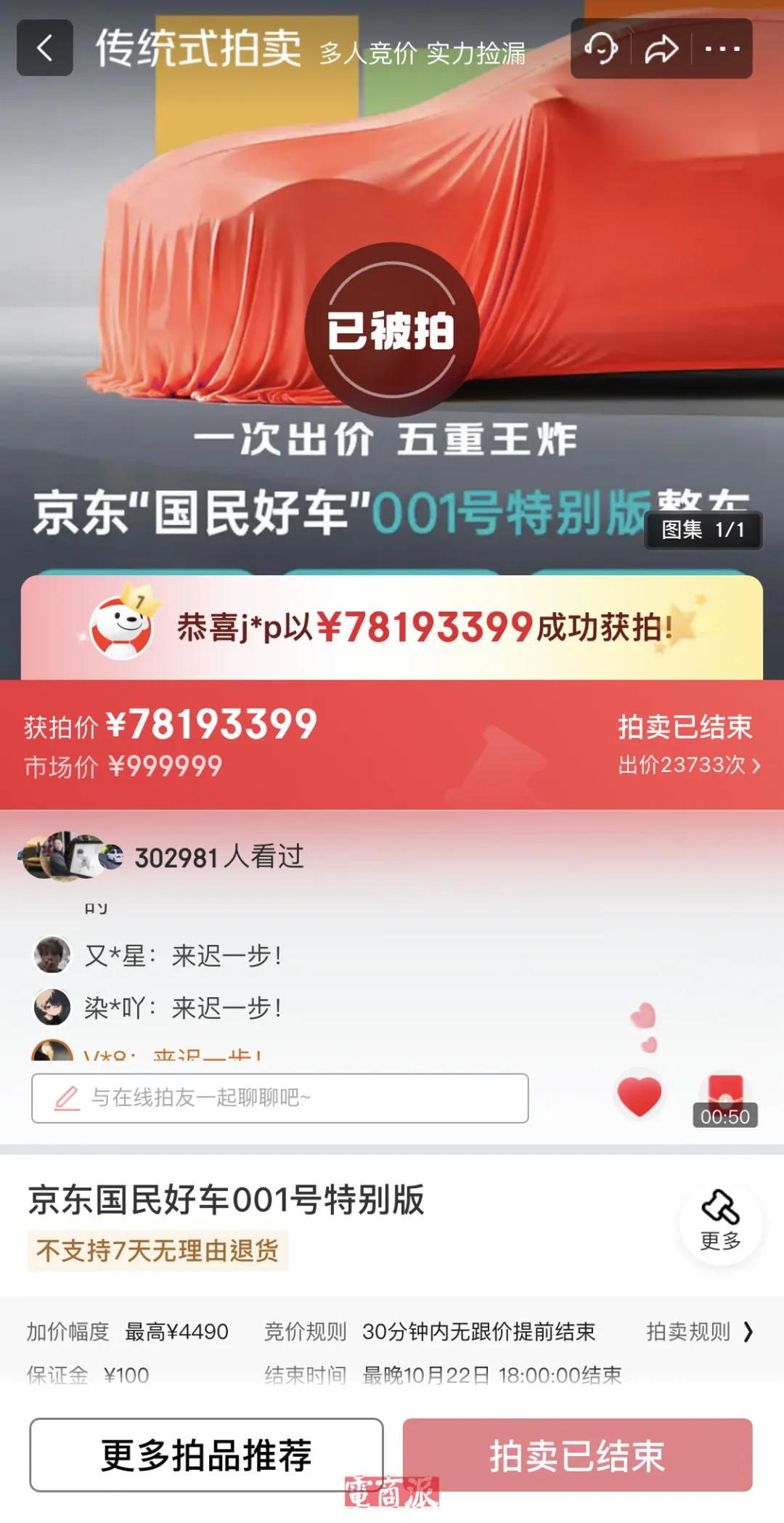 为了给新车造势,京东还把“国民好车”001号拿到拍卖平台开拍,起拍价只要1块钱。结果,26万人蜂拥而至,最后拍到了7819万元。