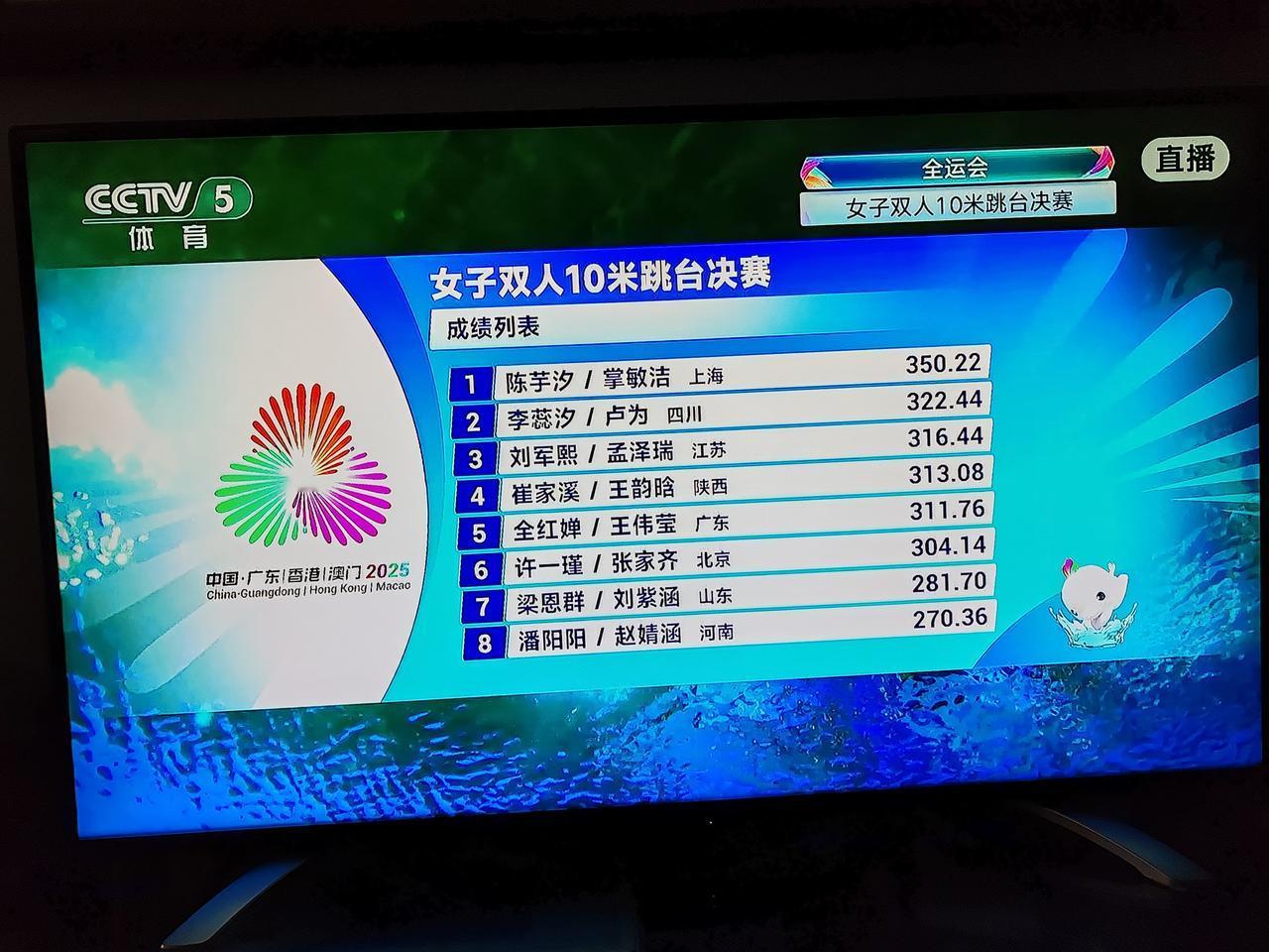 陈芋汐,掌敏捷组合,在刚刚结束的十五届全运会女子双人跳水比赛中,以350.22分,碾压式的领先第二名28分27.78分,第五名38.46分,荣获第十五届全运会女子双人十米高台跳水冠军,为上海代表队获得第一枚金牌。在广东队主场,还存在裁判不公吗?这才是真正的女子双人跳水冠军。下面是最后二轮的成绩。