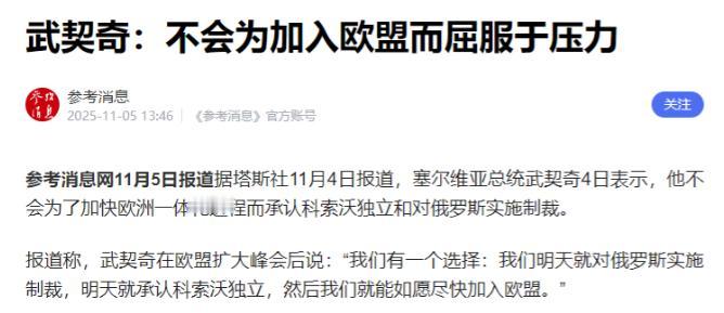这才是最有尊严的选择!武契奇好样的!据塔斯社11月4日报道,塞尔维亚总统武契奇4日表示,他不会为了加快欧洲一体化进程而承认科索沃独立和对俄罗斯实施制裁。 武契奇这波操作太提气了!换做软骨头,面对欧盟那诱惑,早就把国家根本抛到脑后了。 要知道塞尔维亚盼着加入欧盟不是一天两天了,欧盟可是他们最大的贸易伙伴,能给经济带来不少好处,加入欧盟对塞尔维亚来说是件大事。 但欧盟不地道啊,拿这当筹码,逼着人家认科索沃独立,还要制裁俄罗斯,这哪是谈条件,分明是逼人当软骨头。 科索沃是塞尔维亚的一个省,对塞族人来说,那是祖宗传下来的根,是民族文化的摇篮,就跟咱自己的国土一样,一寸都不能让。 当年北约为了插手巴尔干,打着幌子炸南联盟,还炸了咱中国使馆,这笔账多少人记着呢,后来科索沃单方面宣布独立,塞尔维亚从来没认过,这是国家的红线,谁碰谁就是民族罪人。 欧盟倒好,把承认科索沃当加入的敲门砖,这不是逼着武契奇背叛国家吗?换谁也不能答应啊! 再说说制裁俄罗斯的事儿,塞尔维亚跟俄罗斯的关系一直铁,俄乌冲突起来后,欧洲那帮国家跟着美国起哄,逼着塞尔维亚站队,欧盟主席冯德莱恩之前还当面警告武契奇,让他在所谓“民主和专制”之间选边站。 可武契奇心里门儿清,塞尔维亚是独立国家,凭啥要看别人脸色过日子?再说俄罗斯从来没亏过塞尔维亚,关键时刻都是真帮忙,哪能说制裁就制裁? 更别提塞尔维亚本来就主张中立,不想掺和大国纷争,欧盟这是硬把人往绝路上逼。 武契奇自己也说了,欧盟给他画了个饼,说只要承认科索沃、制裁俄罗斯,一年内就能加入欧盟。 这话听着诱惑,其实满是算计,他偏不上当,直接回怼“这些步骤我们不能接受”,还说政策得自己国家说了算,不是别人指手画脚就能定的。 你听听这口气,多硬气!这才是当家人该有的样子,把国家尊严和民族利益攥得死死的。 可能有人不懂,塞尔维亚明明想入欧,为啥非要跟欧盟硬刚?其实塞尔维亚也难啊,经济上离不了欧盟,可再难也不能丢了骨气。 武契奇心里清楚,要是为了入欧卖了科索沃,认了这个分裂的事实,那他就是塞尔维亚的千古罪人,老百姓第一个不答应。 至于制裁俄罗斯,更是没道理,塞尔维亚跟俄罗斯没仇,反而有不少合作,跟着制裁只能让自己吃亏,这种损人不利己的事儿,清醒的人都不会干。 之前疫情的时候,武契奇就看透欧盟了,当时塞尔维亚急需援助,欧盟根本不管不顾,还是咱中国第一时间送物资、派专家,武契奇当时都感动得掉眼泪,说“欧洲的团结是童话,中国才是真朋友”。 现在欧盟又来逼他,他能不明白谁真心谁假意吗?所以这次他才这么坚决,不被利益诱惑,不被压力打垮。 说真的,现在这年头,能顶住大国压力,守住国家根本的领导人不多了,武契奇知道啥该守、啥不能让,这不是固执,是有担当。 欧盟以为拿入欧资格就能拿捏住塞尔维亚,没想到碰了个硬钉子,这事儿不光塞尔维亚人支持,咱看着都解气,毕竟谁都佩服有骨气的人,谁都维护国家领土完整的底线。 有人可能觉得塞尔维亚会被欧盟穿小鞋,说不定以后入欧更难了,但武契奇算得明白,就算入欧再慢,只要国家主权在、民族尊严在,总有盼头;可要是为了快点入欧丢了这些,那加入欧盟又有啥意义?到时候在欧盟里也是抬不起头的软骨头,任人摆布。这种赔本买卖,精明的武契奇才不会做。 说到底,武契奇这选择就是最有尊严的选择,不拿国家核心利益换好处,不看别人脸色做决定,这才是真男人、真领袖。 欧盟的压力再大,诱惑再强,只要心里装着国家和人民,就不会走偏。咱就该为这种有骨气的领导人点赞,武契奇确实好样的!